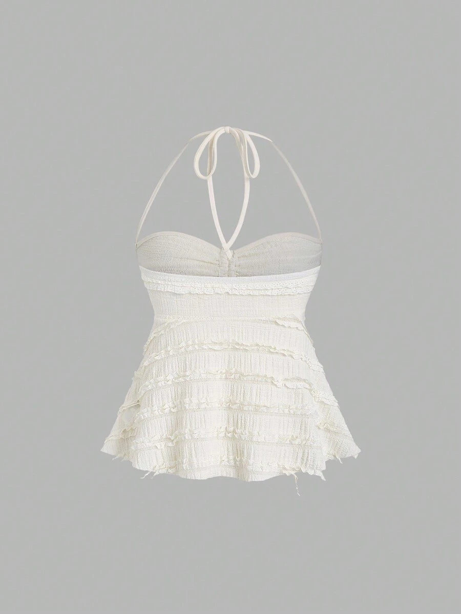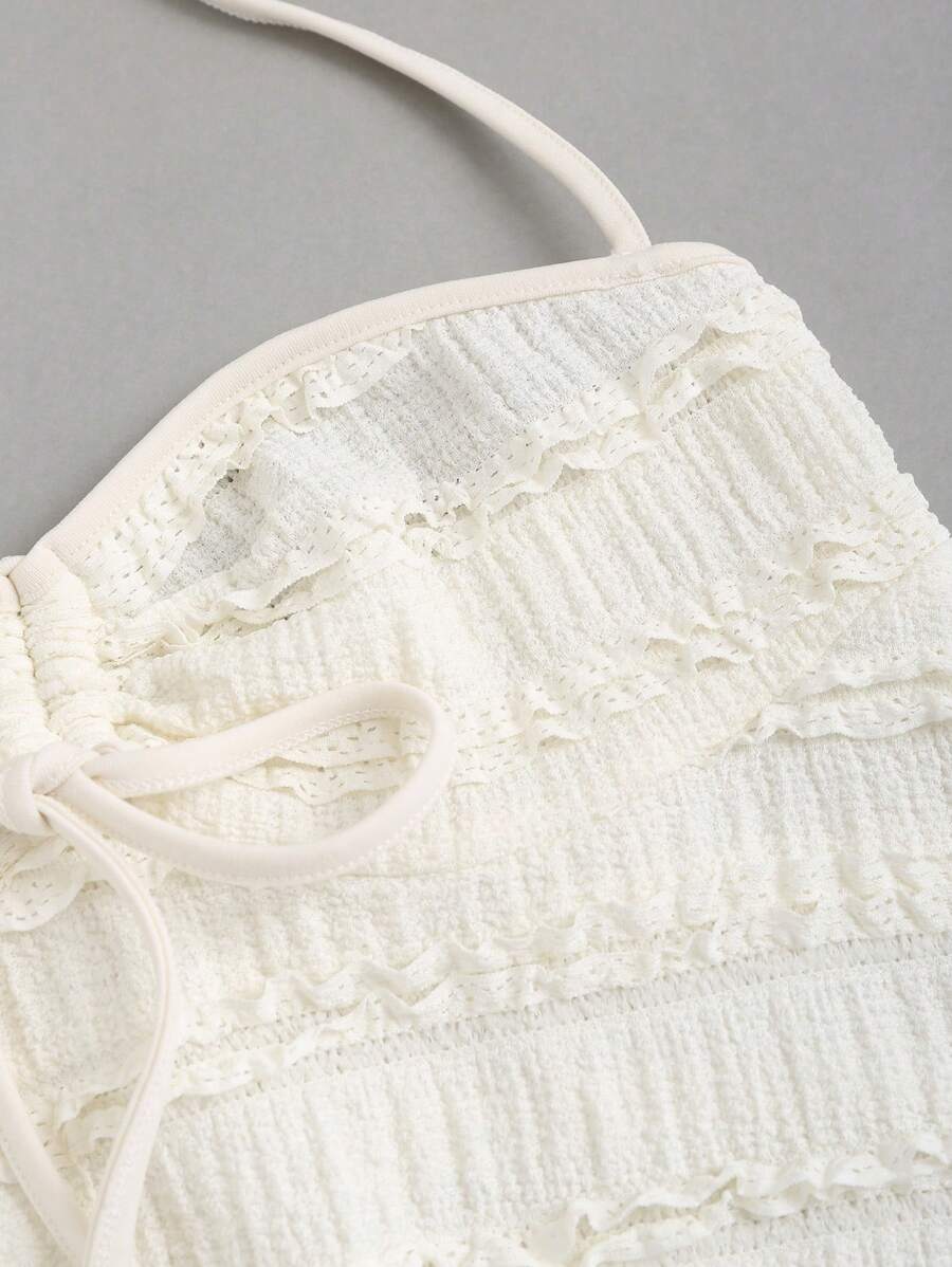توب أبيض بتصميم مكشوف الكتفين ومربوط من الرقبة، مصنوع من خامة قطنية مرنة بخطوط بارزة خفيفة. الجزء العلوي مصمم بشكل بسيط ومتماسك، والجزء السفلي واسع بطبقات خفيفة بتدي شكل أنثوي ناعم. لونه الفاتح وتصميمه الهادئ يخلوه مناسب للأجواء الصيفية أو اللبس الخفيف في الطقس الدافئ.