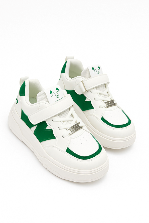 حذاء رياضي للأطفال بتصميم عصري مريح، باللون الأبيض مع لمسات خضراء جذابة على الجوانب واللسان. مزود بحزام لاصق وشرائط أربطة لتثبيت القدم بشكل آمن وسهل للارتداء. النعل سميك ومرن لتوفير دعم مناسب أثناء الحركة واللعب. خامة الحذاء خفيفة وتسمح بتهوية القدم، مناسبة لجميع الأنشطة اليومية.