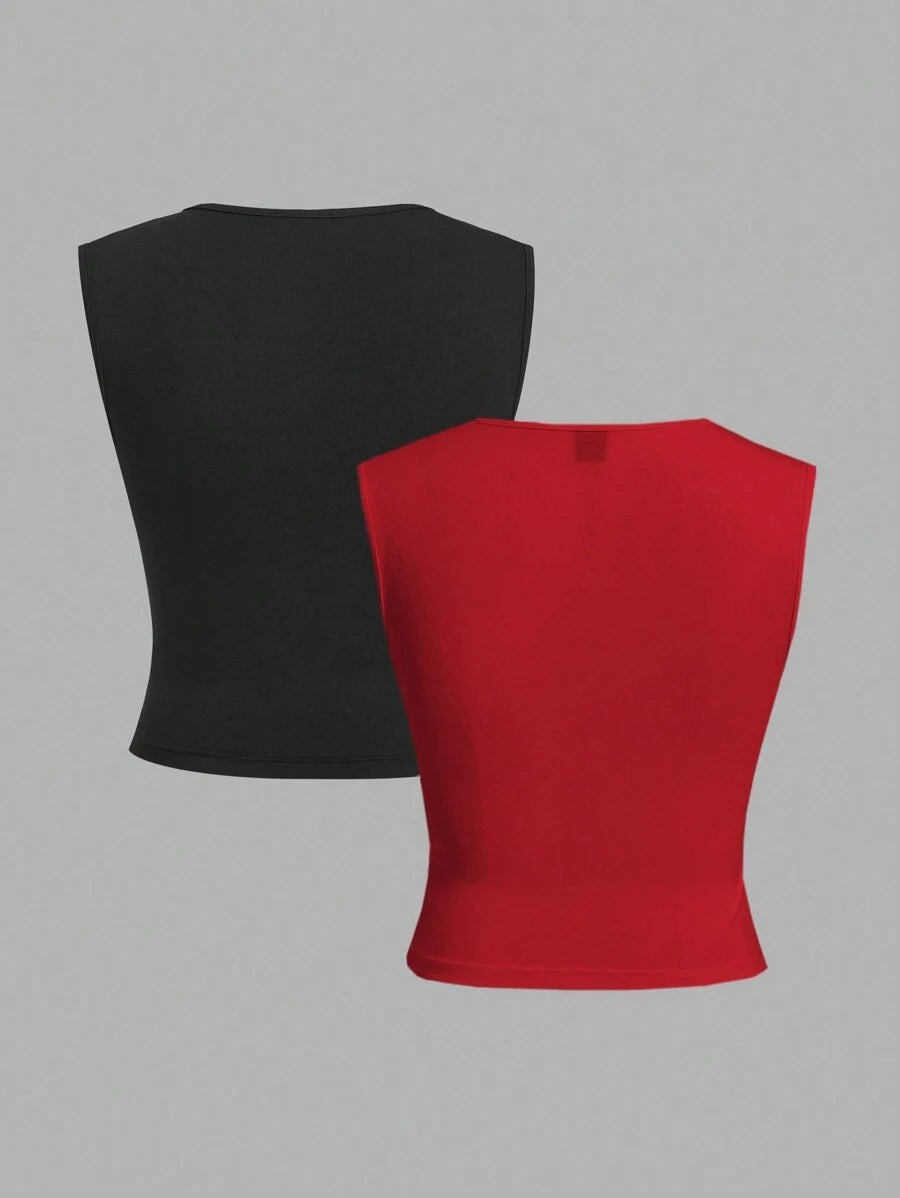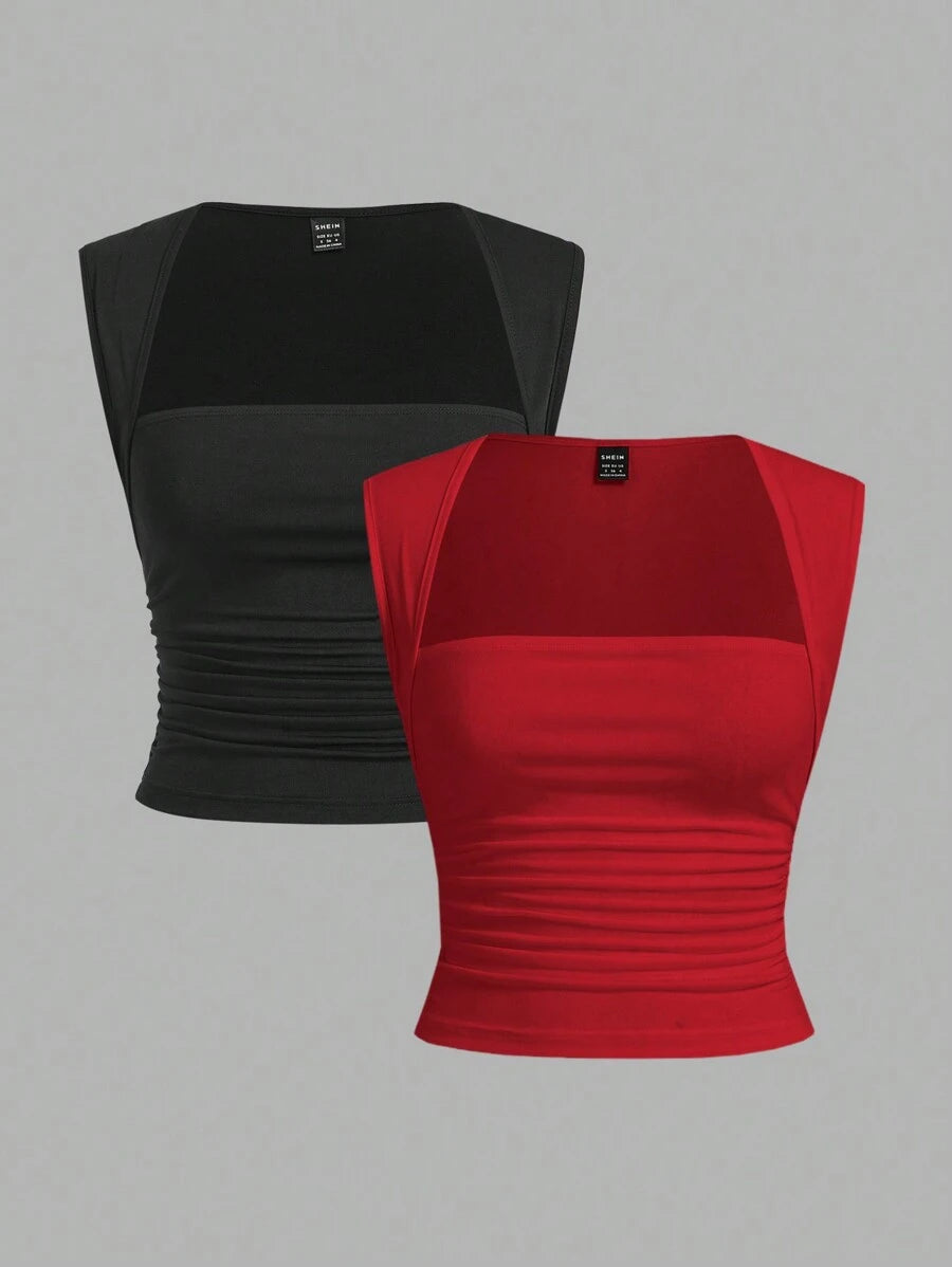 مجموعة SHEIN EZwear المكونة من قطعتين من بلوزة نسائية أساسية ضيقة محبوكة