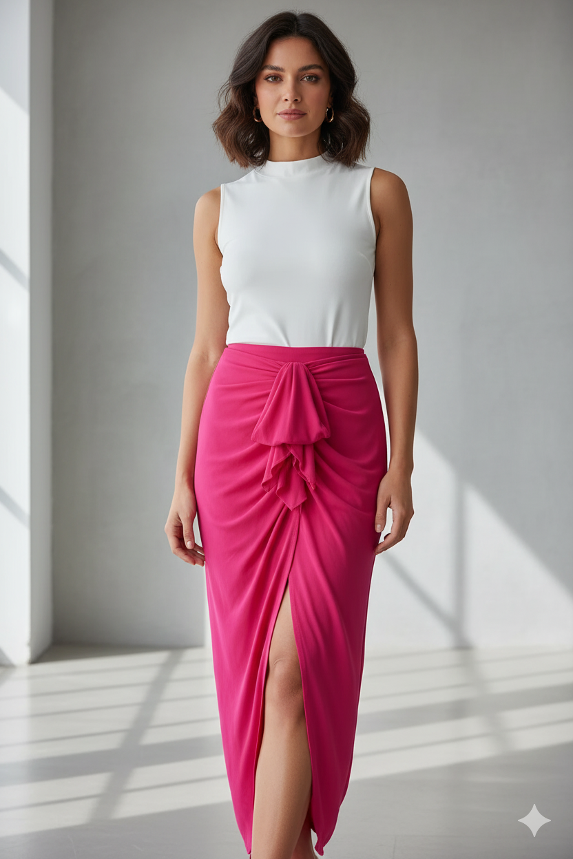 تنورة أنيقة من Shein باللون الفوشيا الحيوي، مصممة بقصة طويلة مع كشكشة وربطة علوية تمنح لمسة أنثوية جذابة. خامة الساتان الناعمة تضيف لمسة فاخرة ولمعان بسيط يناسب الإطلالات المسائية أو الخروجات الأنيقة، مع تصميم عملي يوفر راحة وحركة انسيابية.