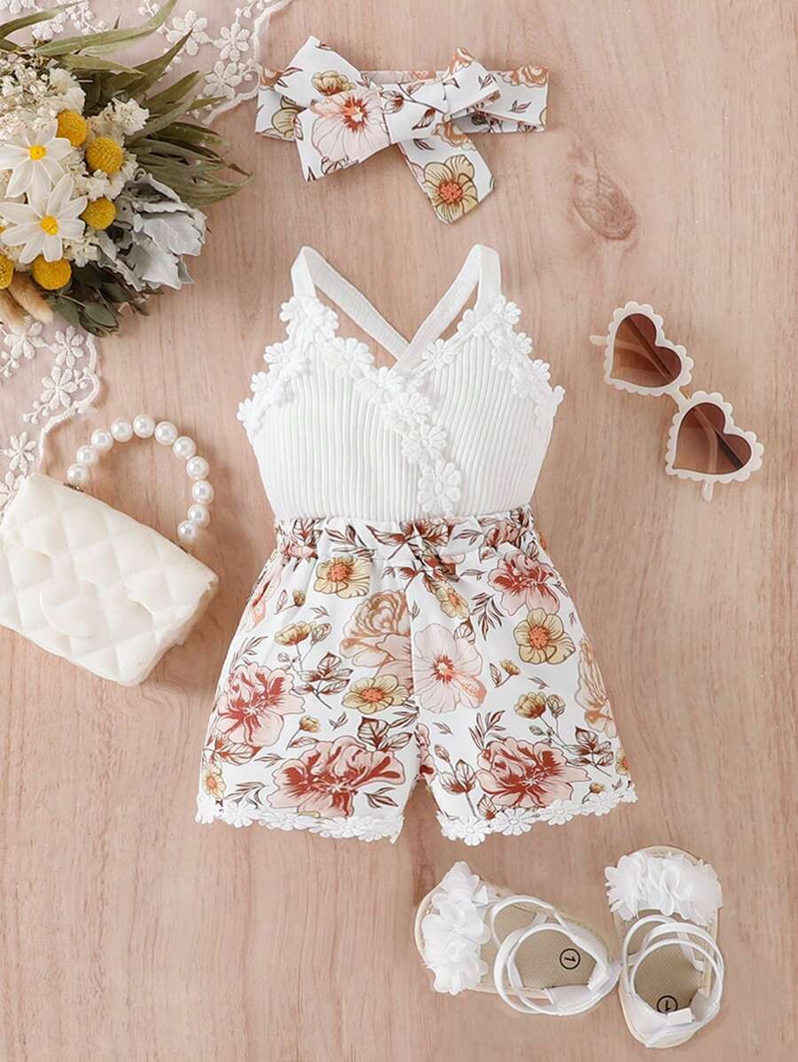 الطقم ده بيجمع بين الراحة والشكل اللطيف في نفس الوقت 🌸، معمول من خامة خفيفة تناسب الجو الصيفي، والتصميم بتاعه بنقشة زهور بألوان هادية مع توب بكتف مجعد بيكمل الشكل بطريقة ناعمة. العصابة اللي بتيجي معاه بتخلي اللوك متكامل وبسيط.