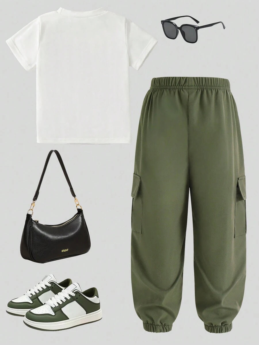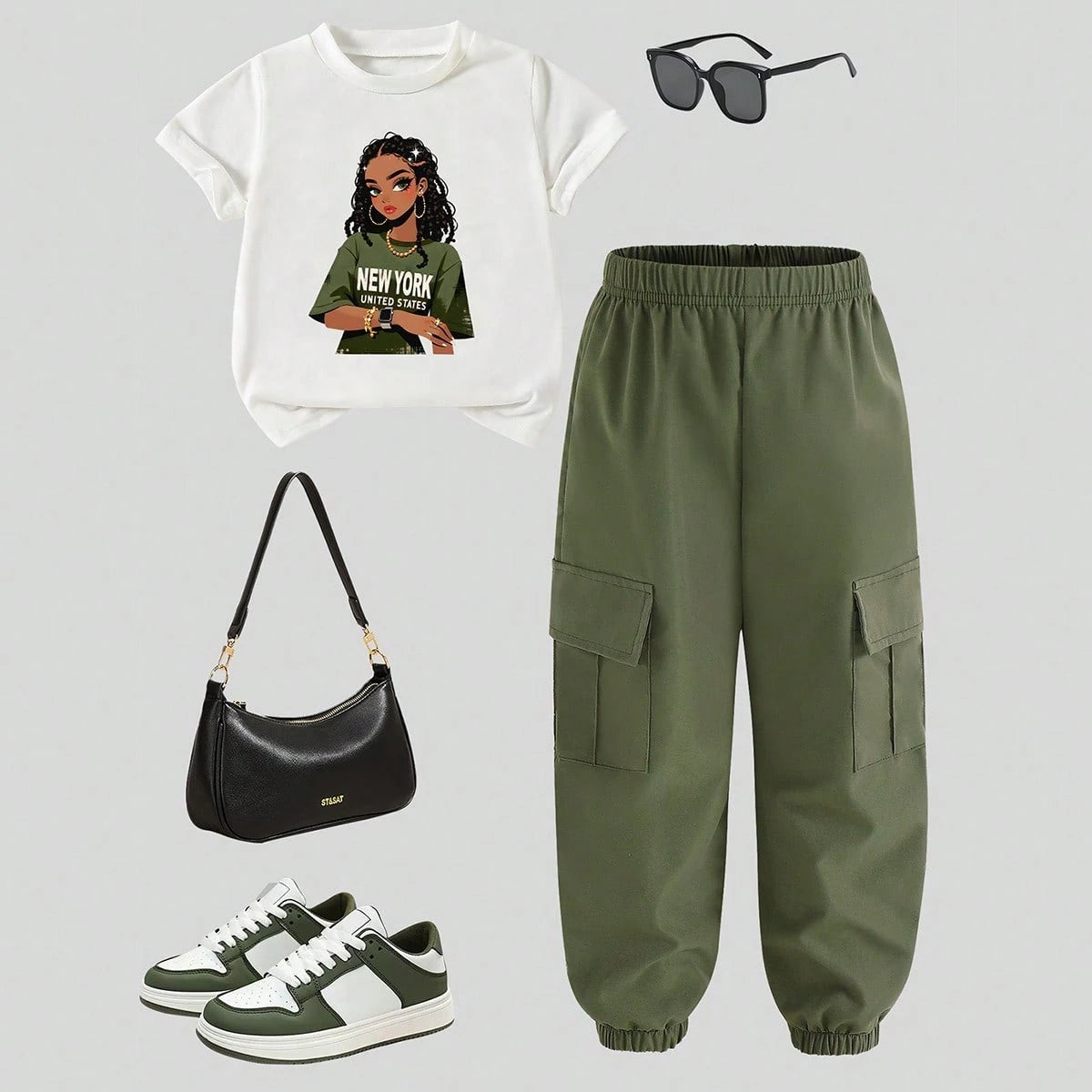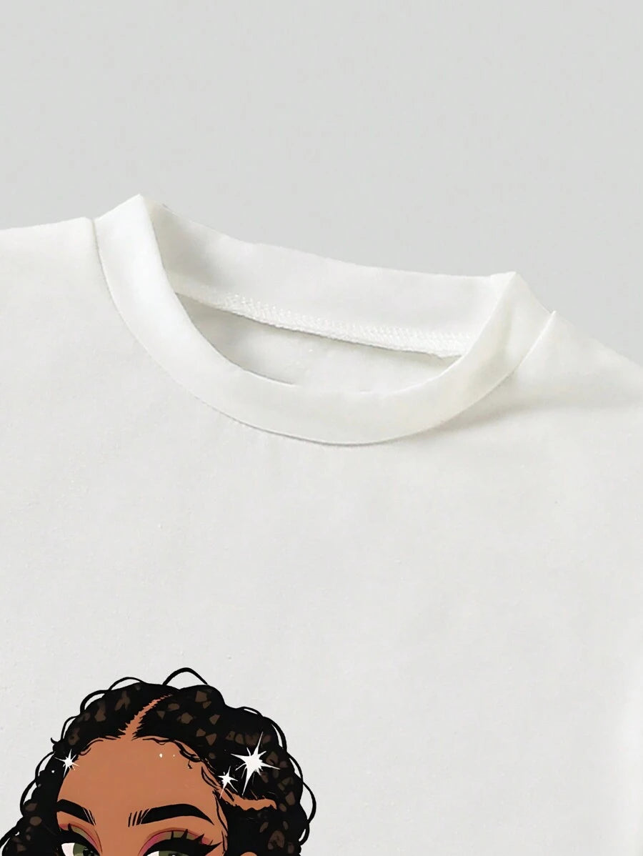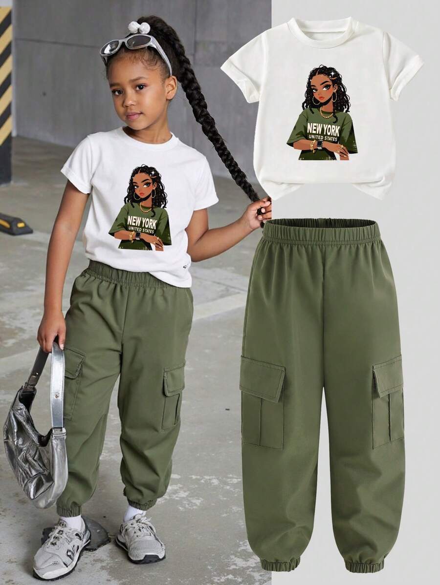 طقم بناتي 2 قطعة من شي إن – تيشيرت كاجوال بطبعة جرافيك مع بنطال