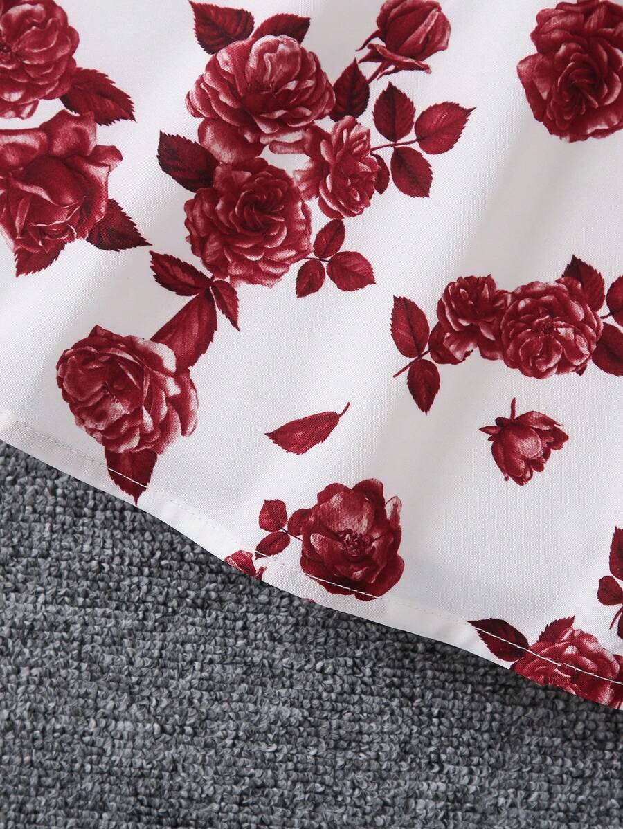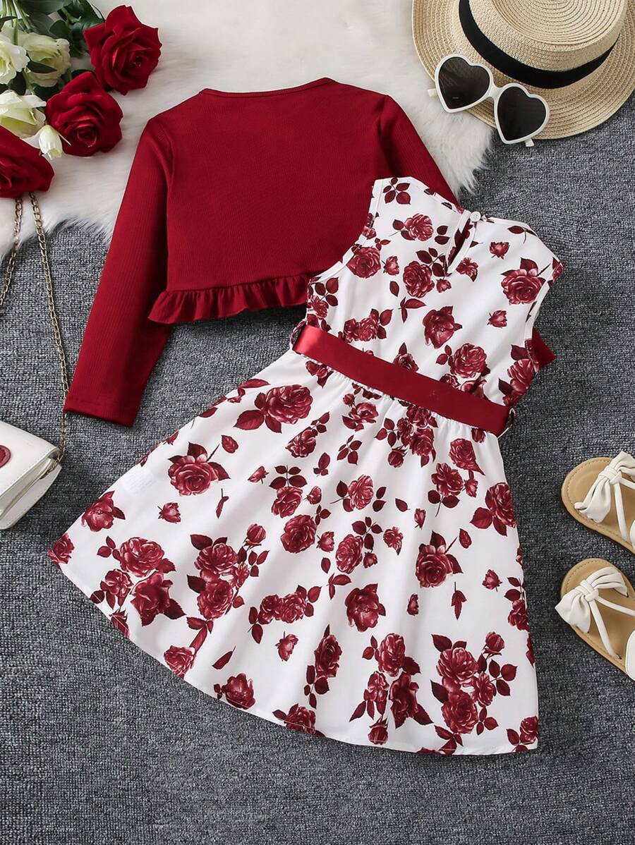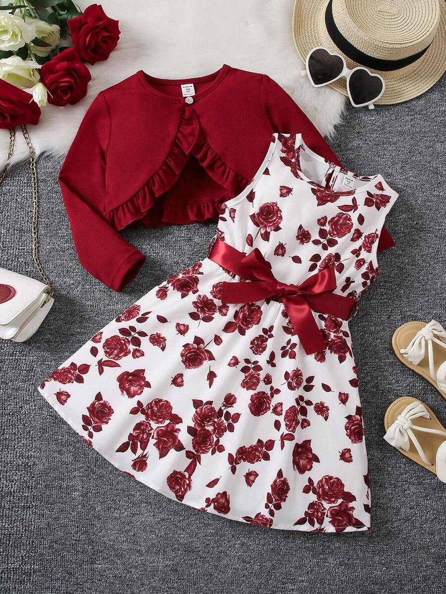 فستان شي إن للفتيات الصغيرات بطبعة زهور مع حزام وكارديجان بحافة مكشكشةShein