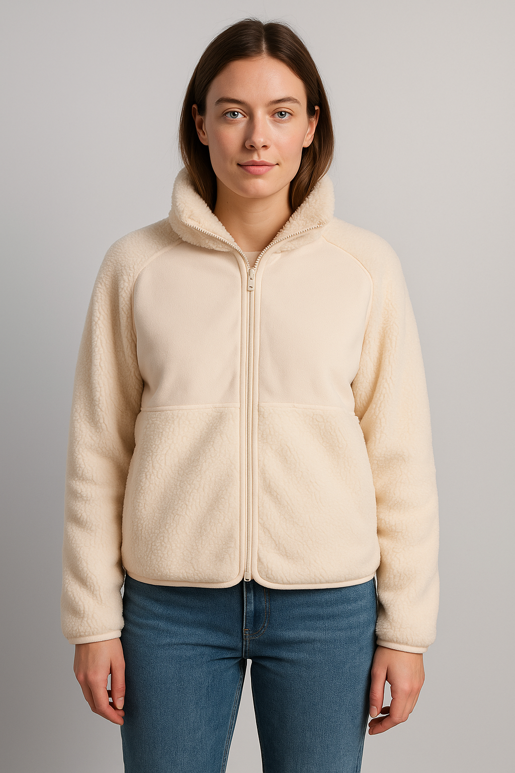 جاكيت عملي بتصميم بسيط ومريح، مناسب للأيام الباردة أو الطقس المعتدل. القماش ناعم ومحبوك بخامة بوليستر 100٪ بتدي إحساس بالدفء من غير ما تكون تقيلة. السحاب الأمامي بيسهّل اللبس والخلع، والقصة الفضفاضة بتخليه مريح جدًا في الحركة. اللون البيج الهادئ بيخليه سهل التنسيق مع أي طقم تاني في خروجاتك اليومية أو المشاوير السريعة.