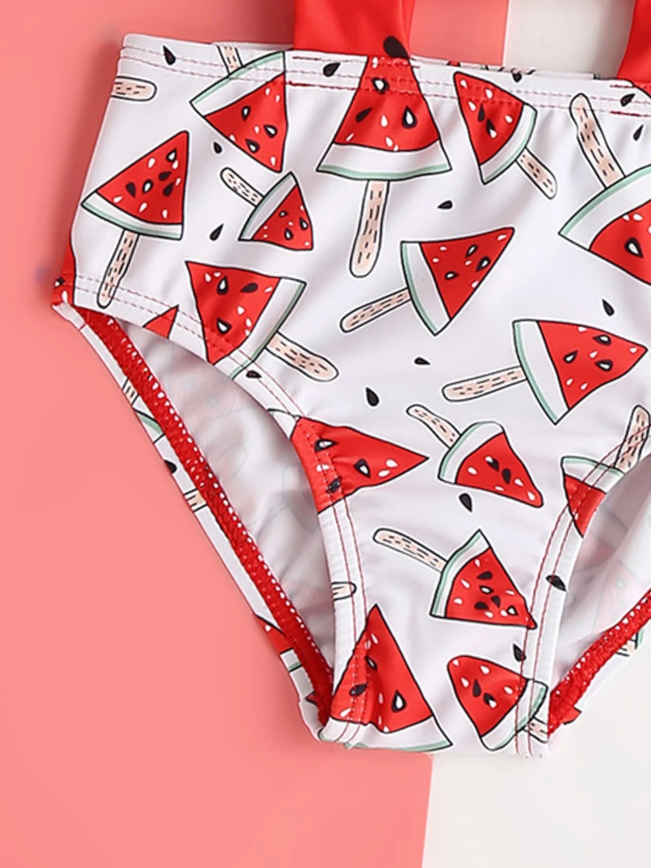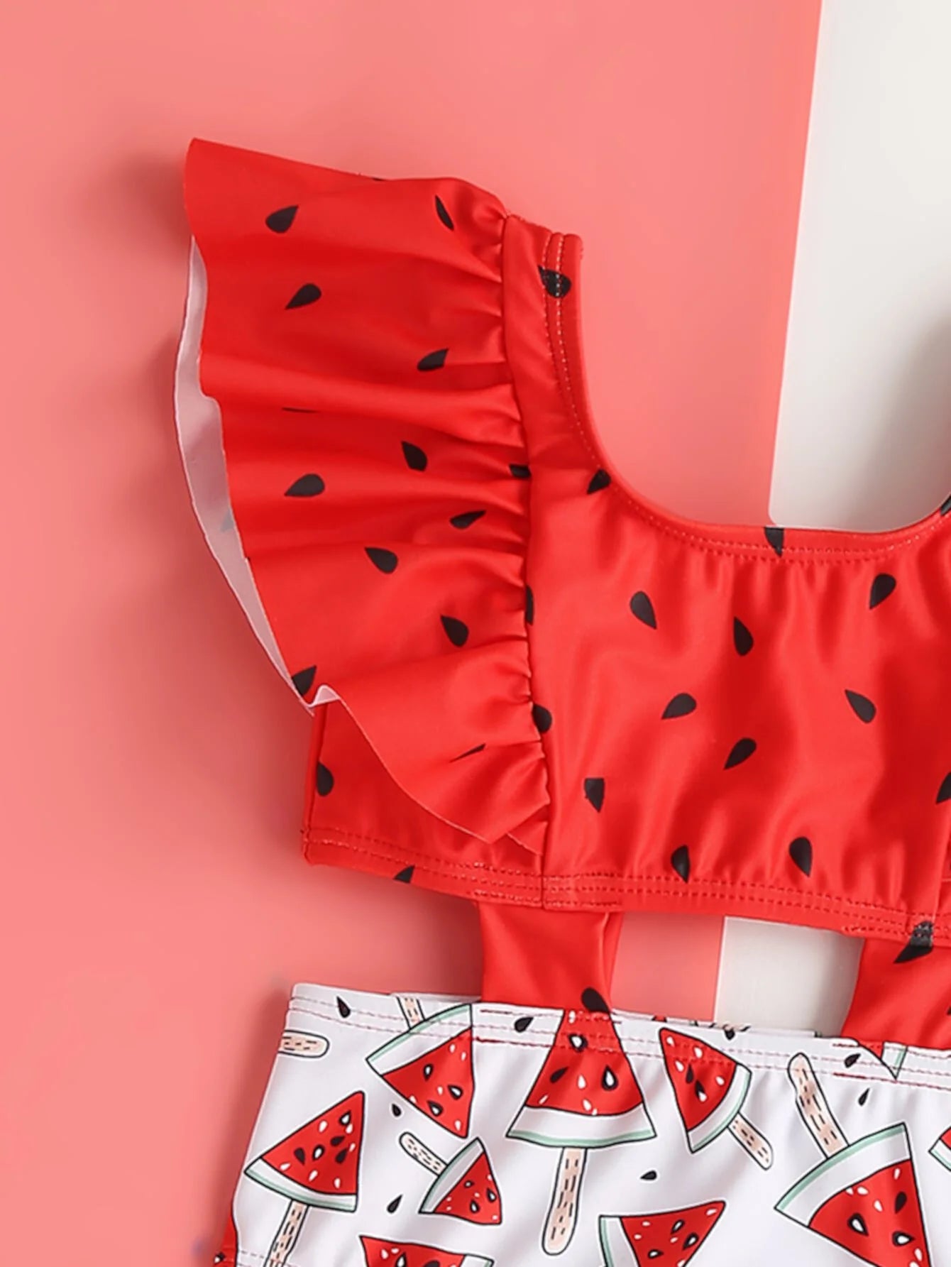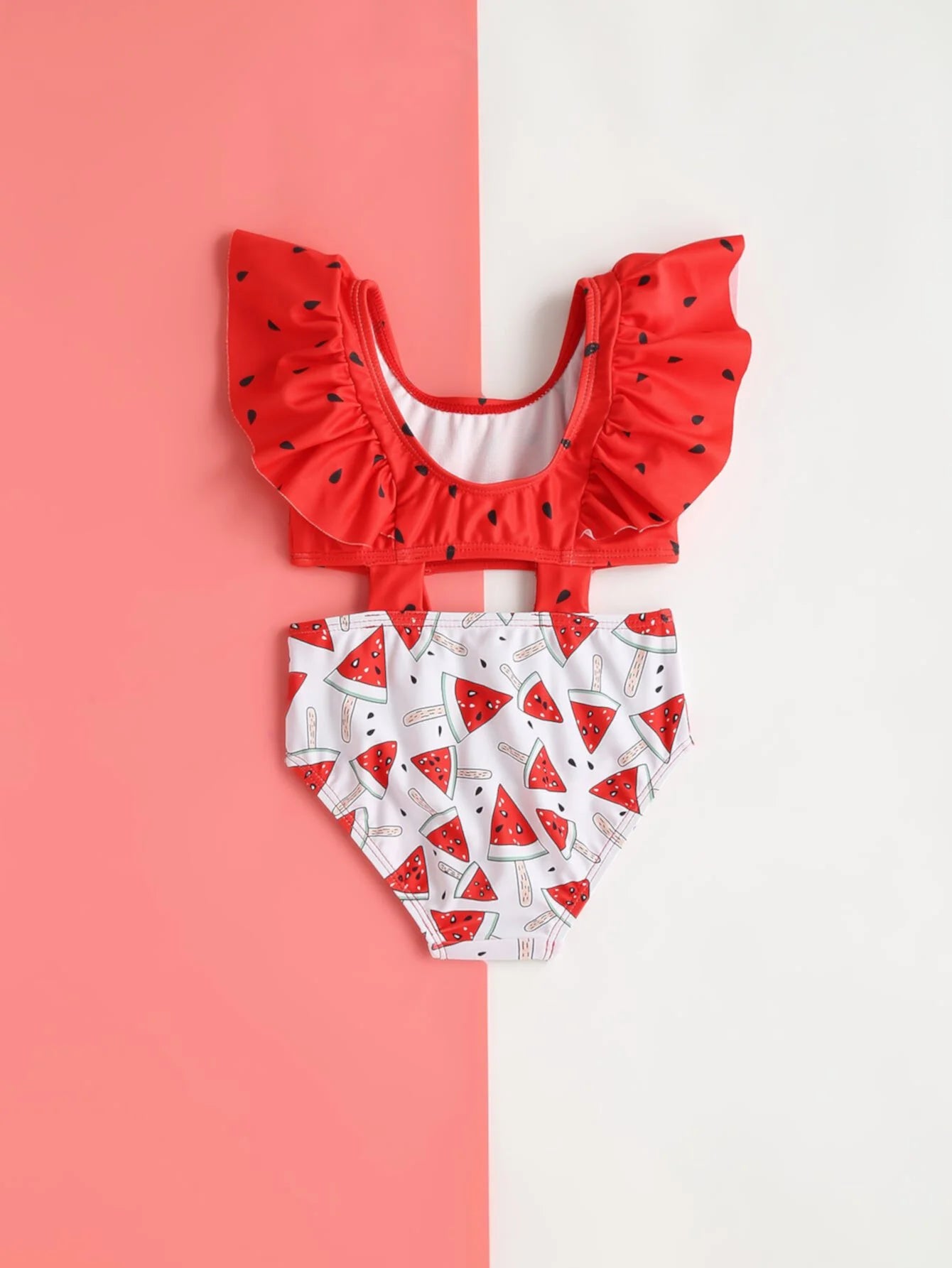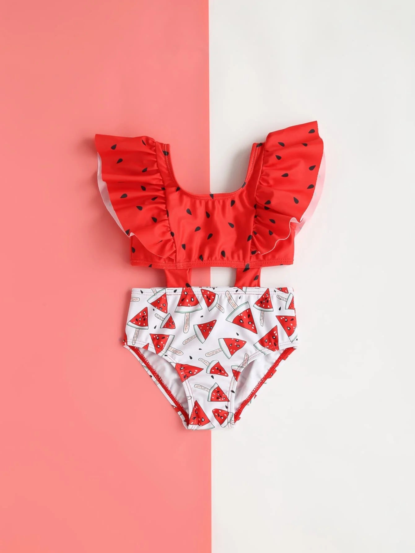 ملابس سباحة SHEIN للفتيات الصغيرات من قطعة واحدة مجوفة بألوان متباينة ومزينة بكشكشة
