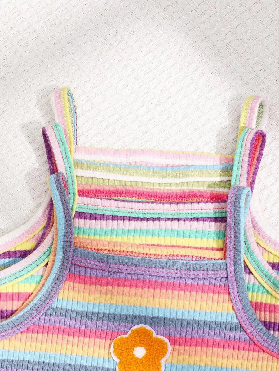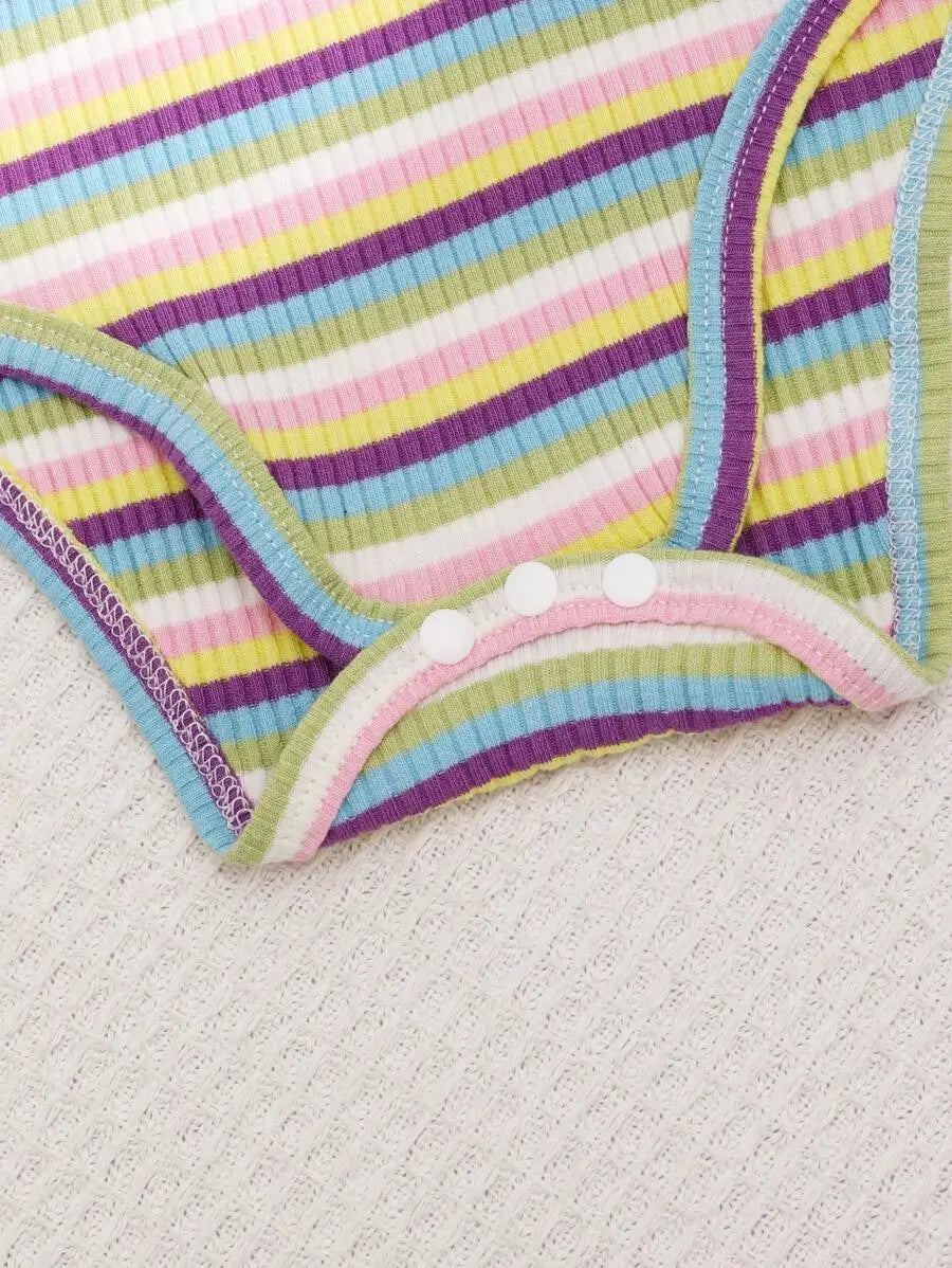 مجموعة من ثلاث بدلات جسم بتصميم مخطط بألوان زاهية ومتنوعة، كل قطعة مزينة بتطريز صغير على شكل زهرة في المنتصف. مصنوعة من خامة قطنية مطاطية خفيفة ومناسبة للاستخدام اليومي، بتصميم بحمالات رفيعة وكباسين سفلية لتسهيل اللبس. الألوان المبهجة تضيف لمسة مرحة على ملابس الأطفال.