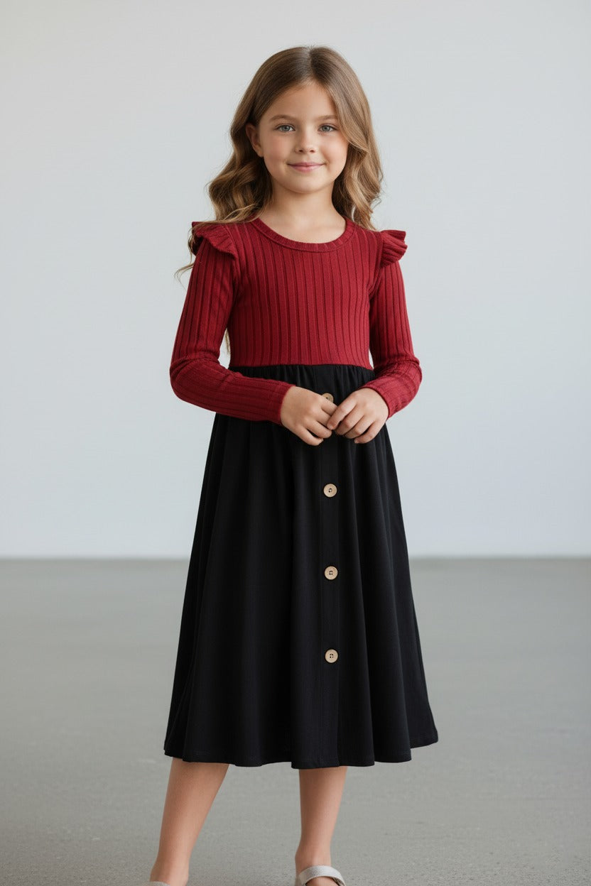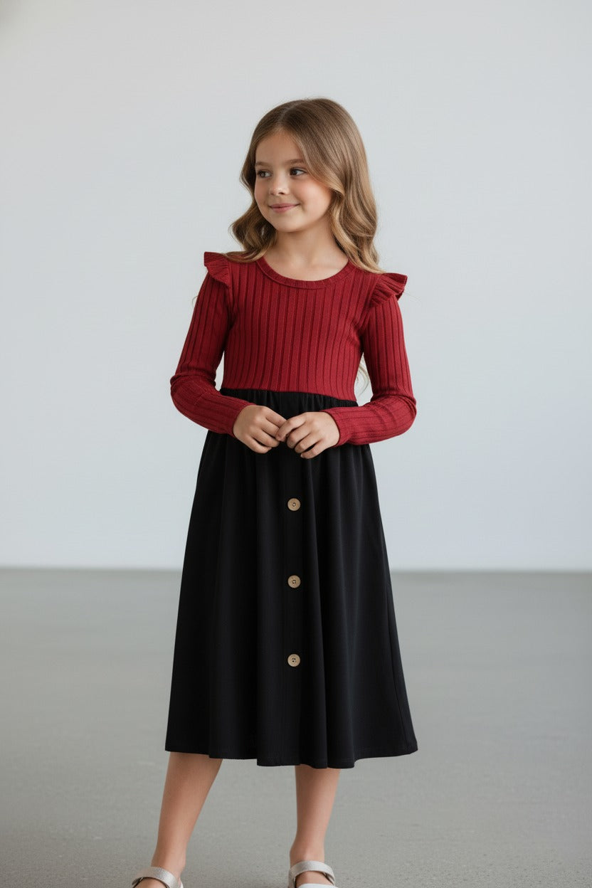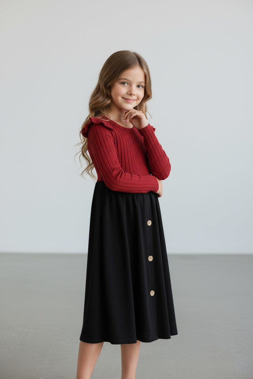 فستان بناتي محبوك بلونين، يجمع بين الجزء العلوي المضلع باللون الأحمر الداكن والأكمام الطويلة المزينة بكشكشة عند الأكتافت تأتي التنورة باللون الأسود السادة وقصة واسعة، وتزدان بصفوف من الأزرار الأمامية لتكتمل إطلالة أنيقة ومريحة للمواسم الباردة.