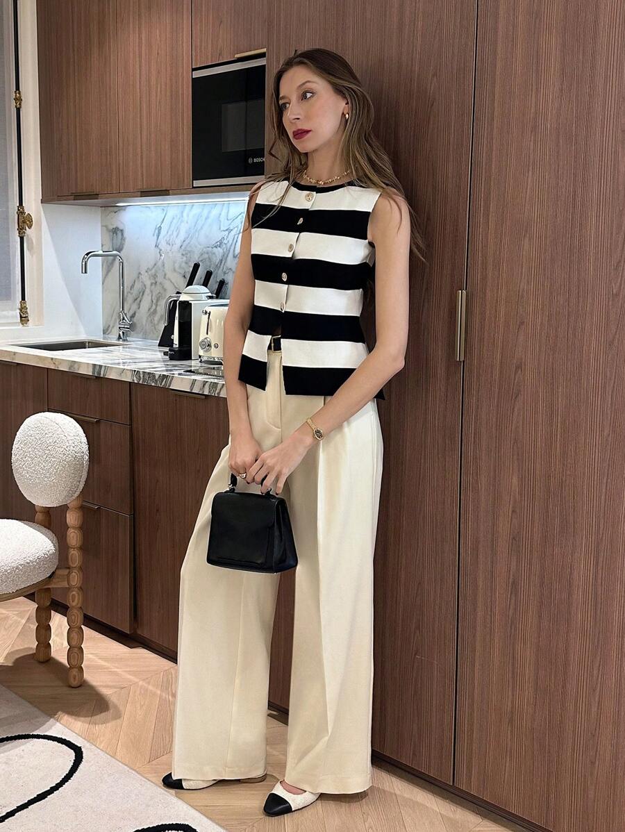 بلوزة فرنسية بسيطةمخططة باللونين الأبيض والأسود من Shein