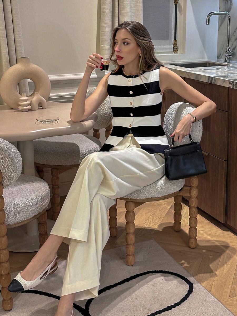 باريورا يونغ آند فاشون، بلوزة فرنسية بسيطة، مناسبة للارتداء اليومي والعطلات والتنقل، مخططة باللونين الأبيض والأسود، برقبة دائرية، وحاشية غير متماثلة بأزرار معدنية، محبوكة منقسمة، متعددة الاستخدامات، قماش منسوج عادي، ربيع/صيف/خريف