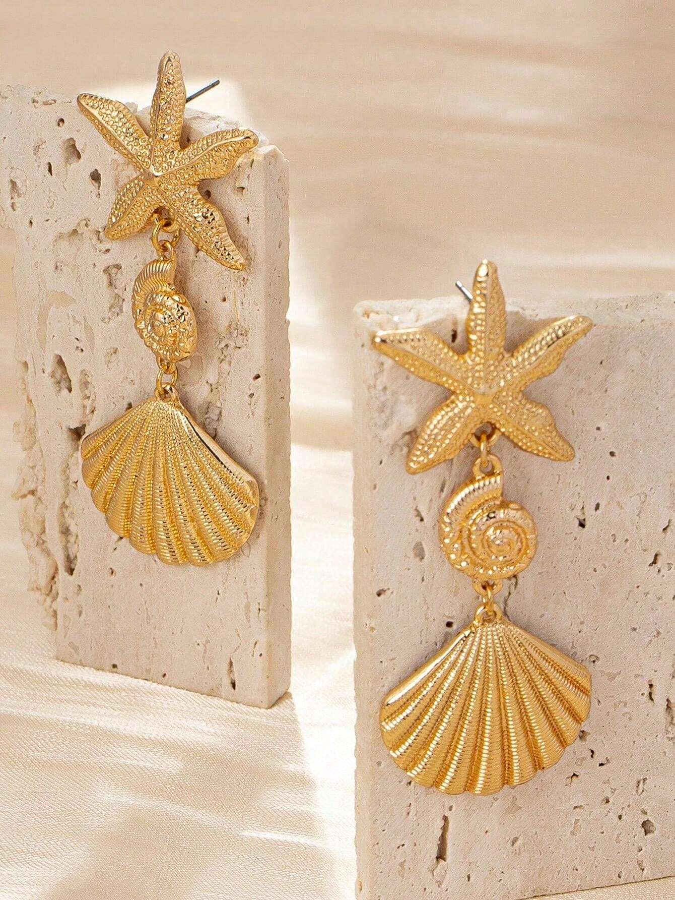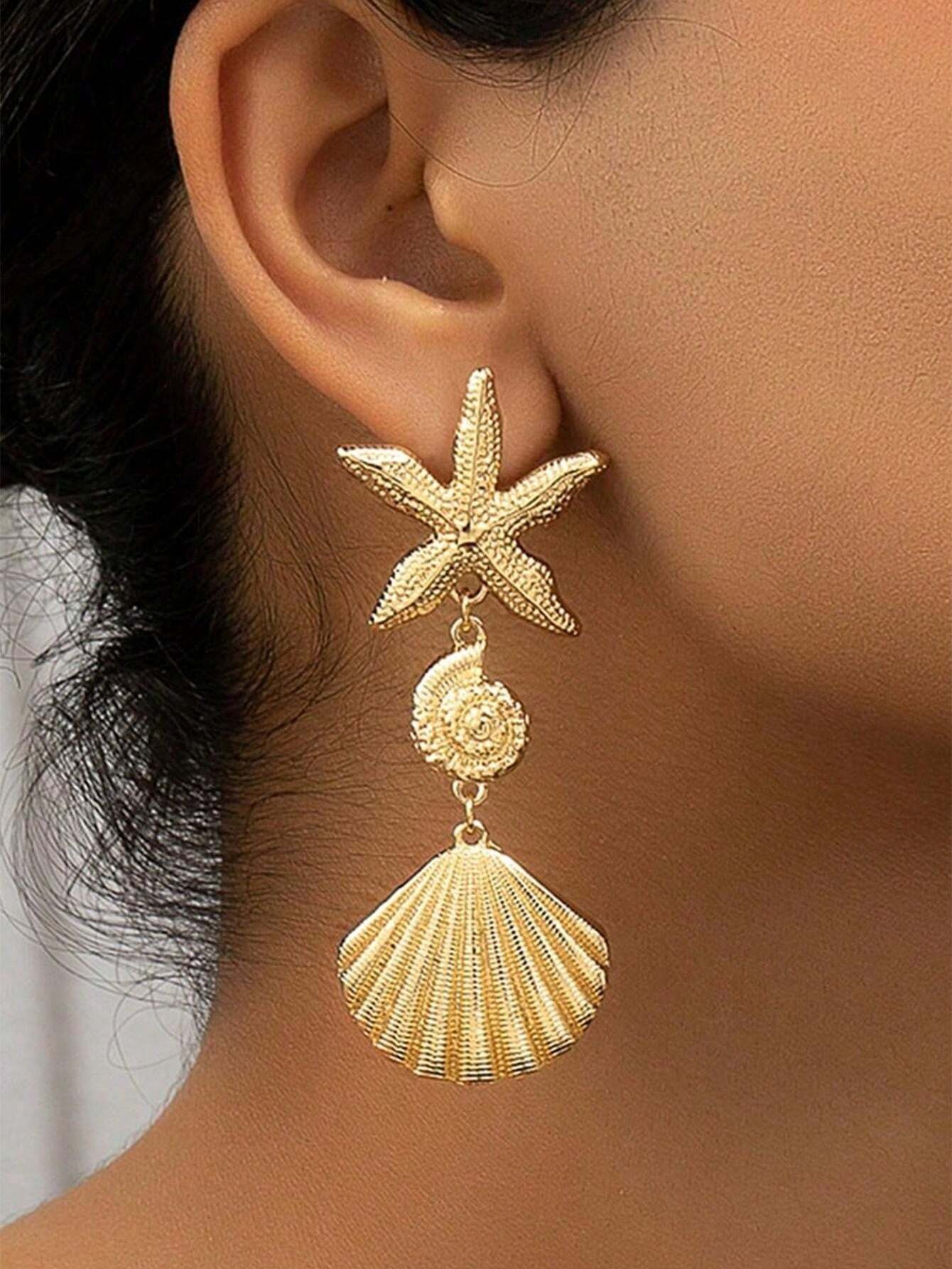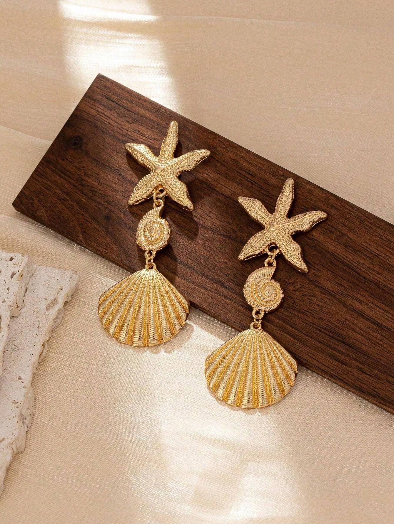 تصميم بحري أنثوي يجمع بين شكل نجمة البحر والصدَف المتدلي بخامة معدنية أنيقة — مثالية لإطلالات الصيف أو البحر.
