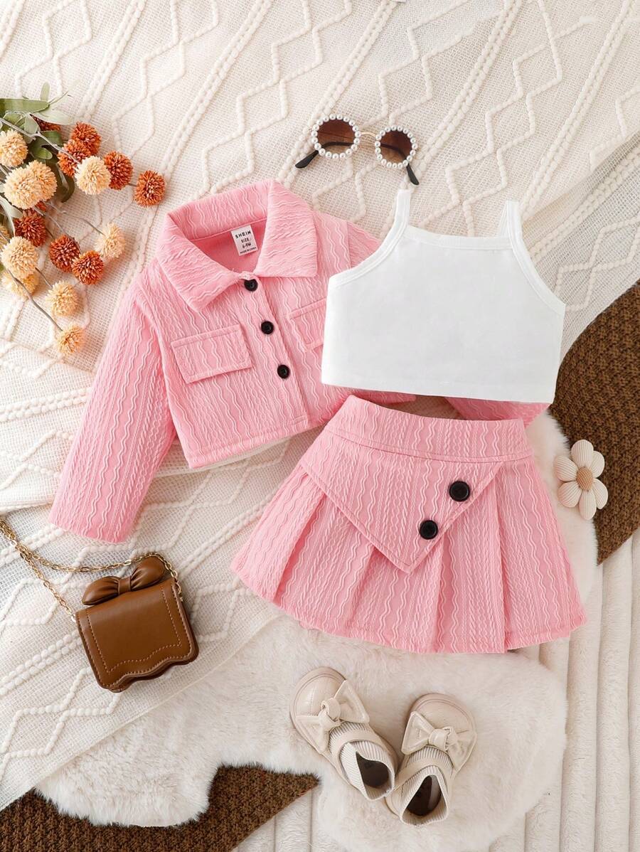 طقم بناتي أنيق مكون من ثلاث قطع يضم جاكيت أنيق وتنورة بأزرار أمامية وتيشيرت داخلي بسيط. يتميز بتصميمه العصري والراقي الذي يجمع بين الأناقة والراحة، مما يجعله مثاليًا للارتداء في الربيع والخريف سواء في النزهات أو المناسبات الخاصة. خامة ناعمة ومريحة تمنح طفلتك إطلالة أنثوية جذابة ومميزة.
