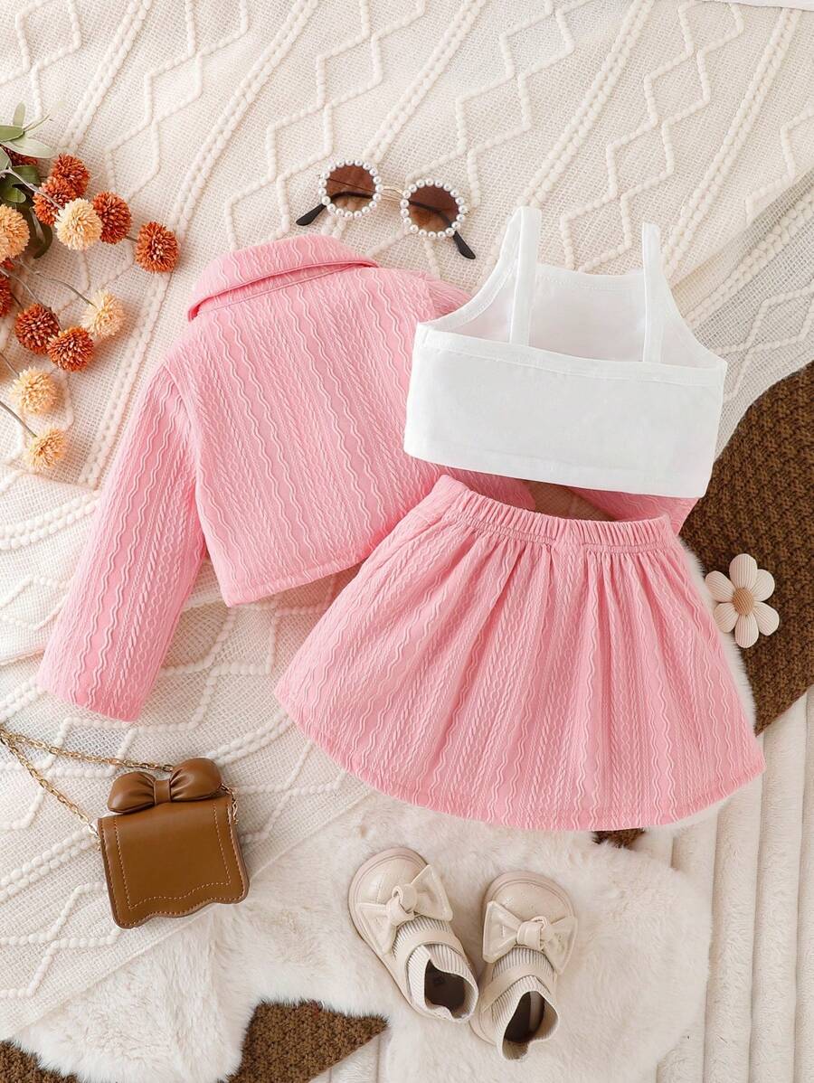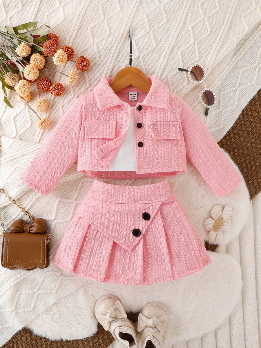 طقم بناتي أنيق من ثلاث قطع، يتكون من جاكيت وتنورة بأزرار أنيقة، مناسب للربيع والخريف