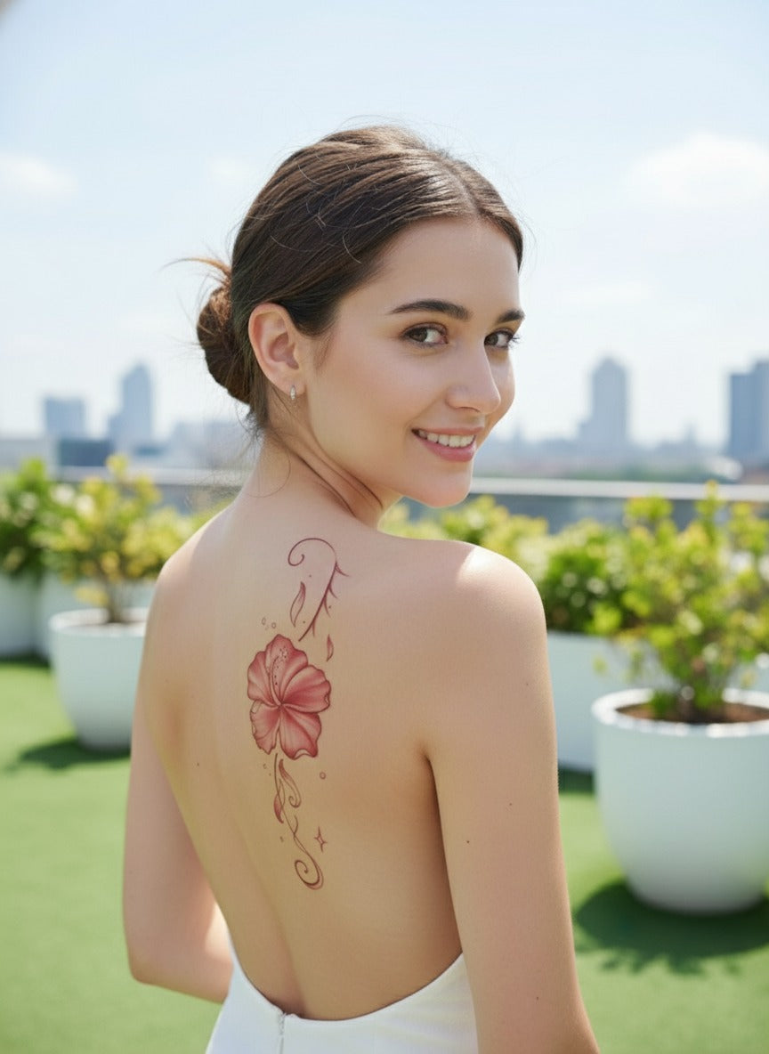 تاتو مؤقت بتصميم زهرة حمراء مستوحى من الفن الآسيوي، سهل اللصق ومقاوم للماء والعرق. مناسب للذراع أو الظهر ويمنحك لمسة جمالية عصرية للاستخدام اليومي.