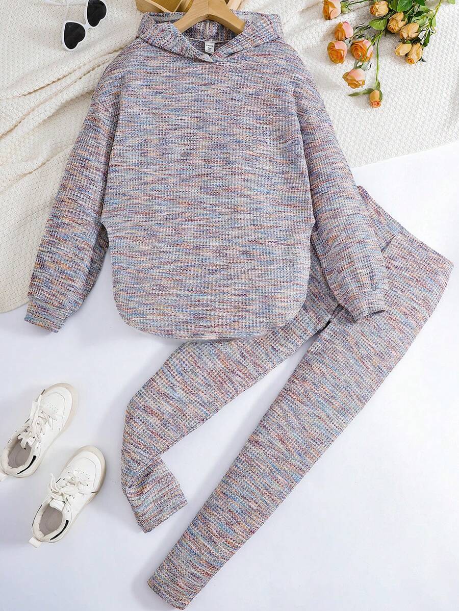 مجموعة من قطعتين من SHEIN للفتيات المراهقات، بقلنسوة وبنطال ضيق ملون، سويت شيرت محبوك غير رسمي مع حاشية مقوسة وبنطلون مطاطي، مريح للارتداء في الهواء الطلق والمنزل