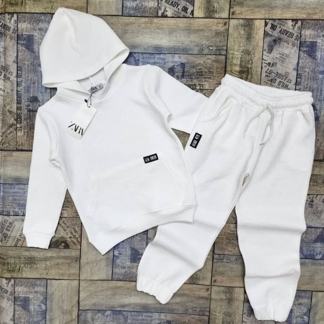طقم أطفال بسيط مكوّن من سويت شيرت بقبعة وبنطلون رياضي بنفس الخامة، بلون أبيض موحّد يمنح شكل هادئ ونظيف. القماش ناعم ومناسب للبس اليومي، والتصميم عملي بفضل قصته المريحة والياقات والأساور المطاطية. الطقم مناسب للاستخدام اليومي سواء داخل البيت أو في الخروجات الخفيفة، ويتميز بثبات اللون وشكله المرتّب عند اللبس.