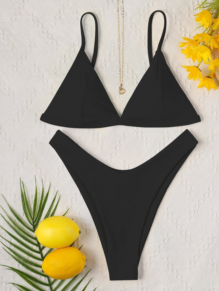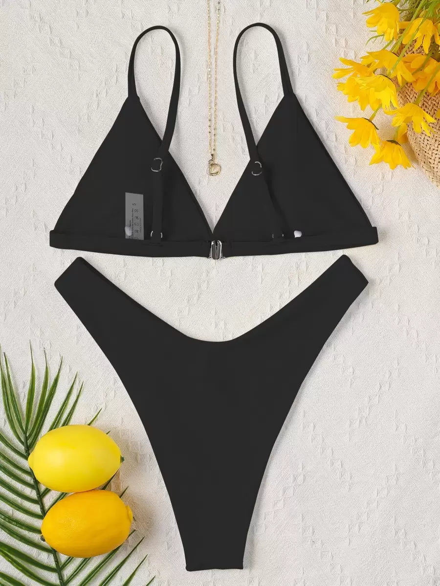 طقم بيكيني صيفي من قطعتين – توب مثلث وبكيني بخصر عالٍ بتصميم أنيق بلون موحد