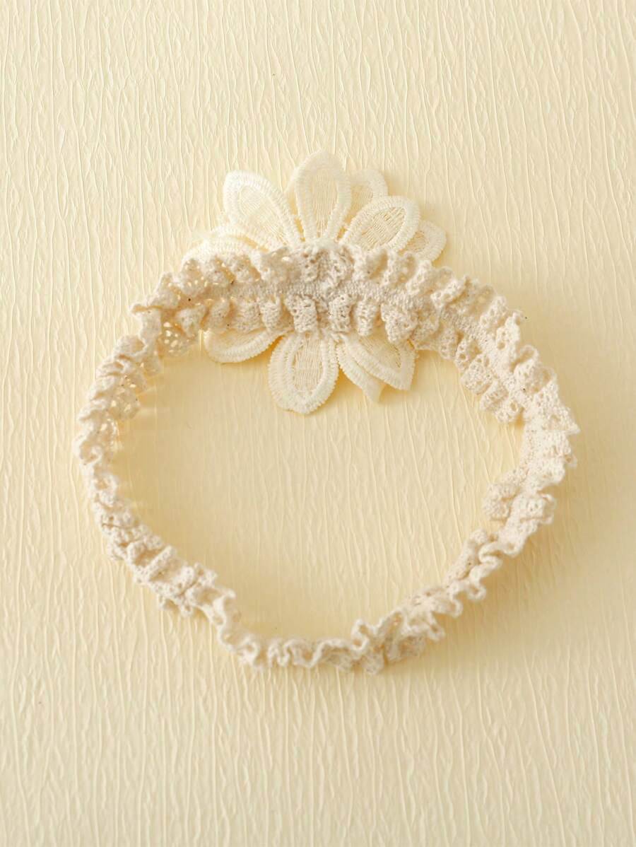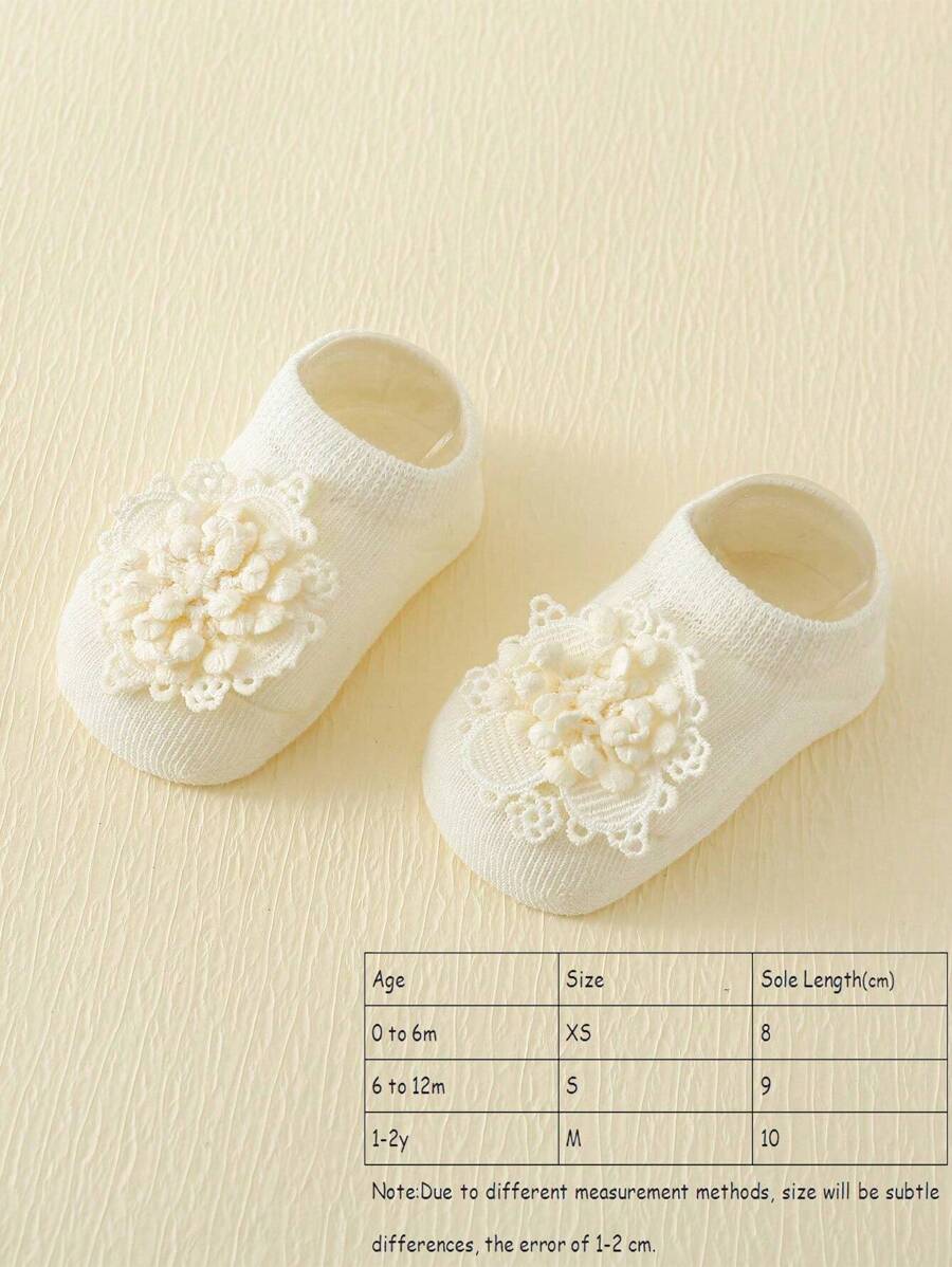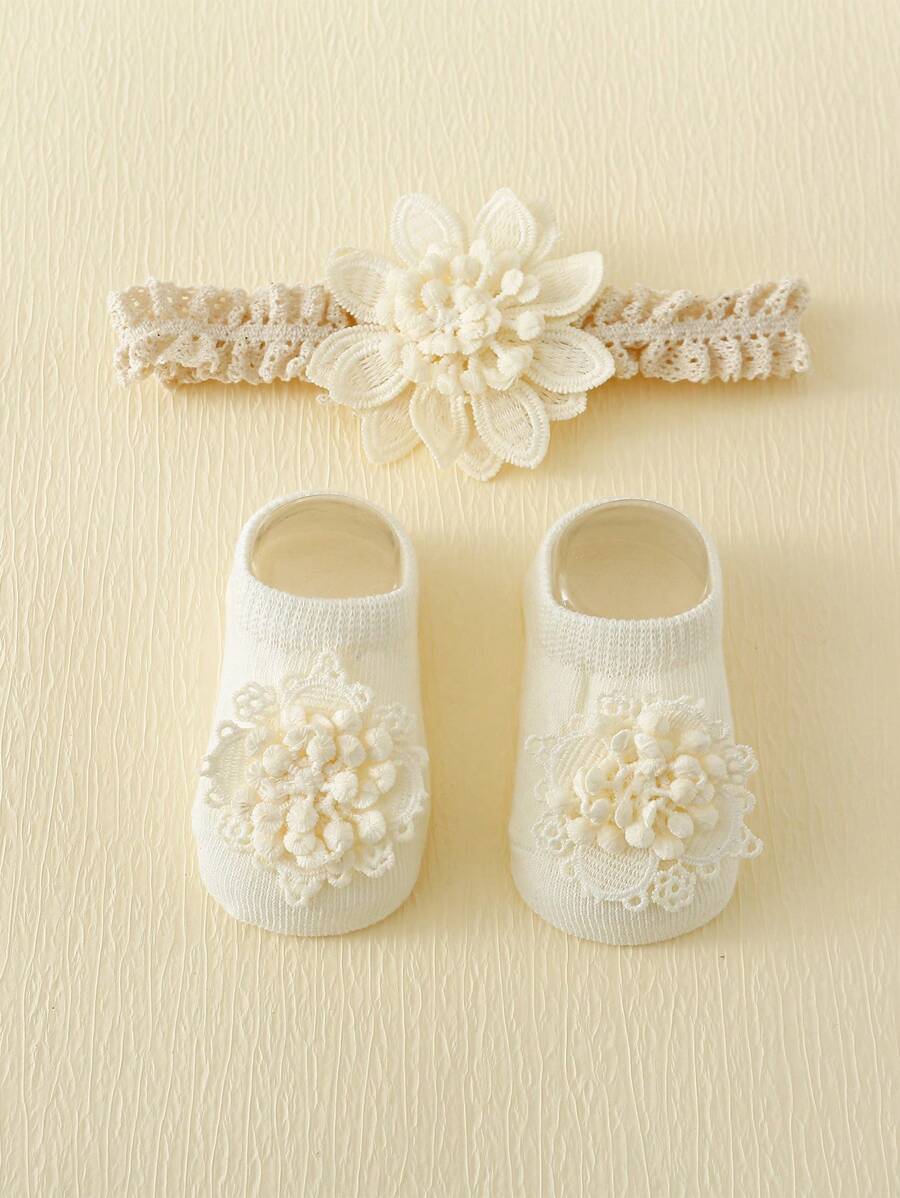 طقم شرابات أطفال بيضاء مضادة للانزلاق مع تطريز زهري + ربطة رأس للرضّع