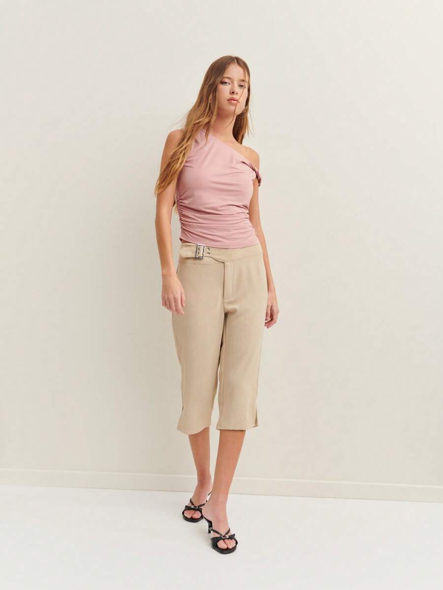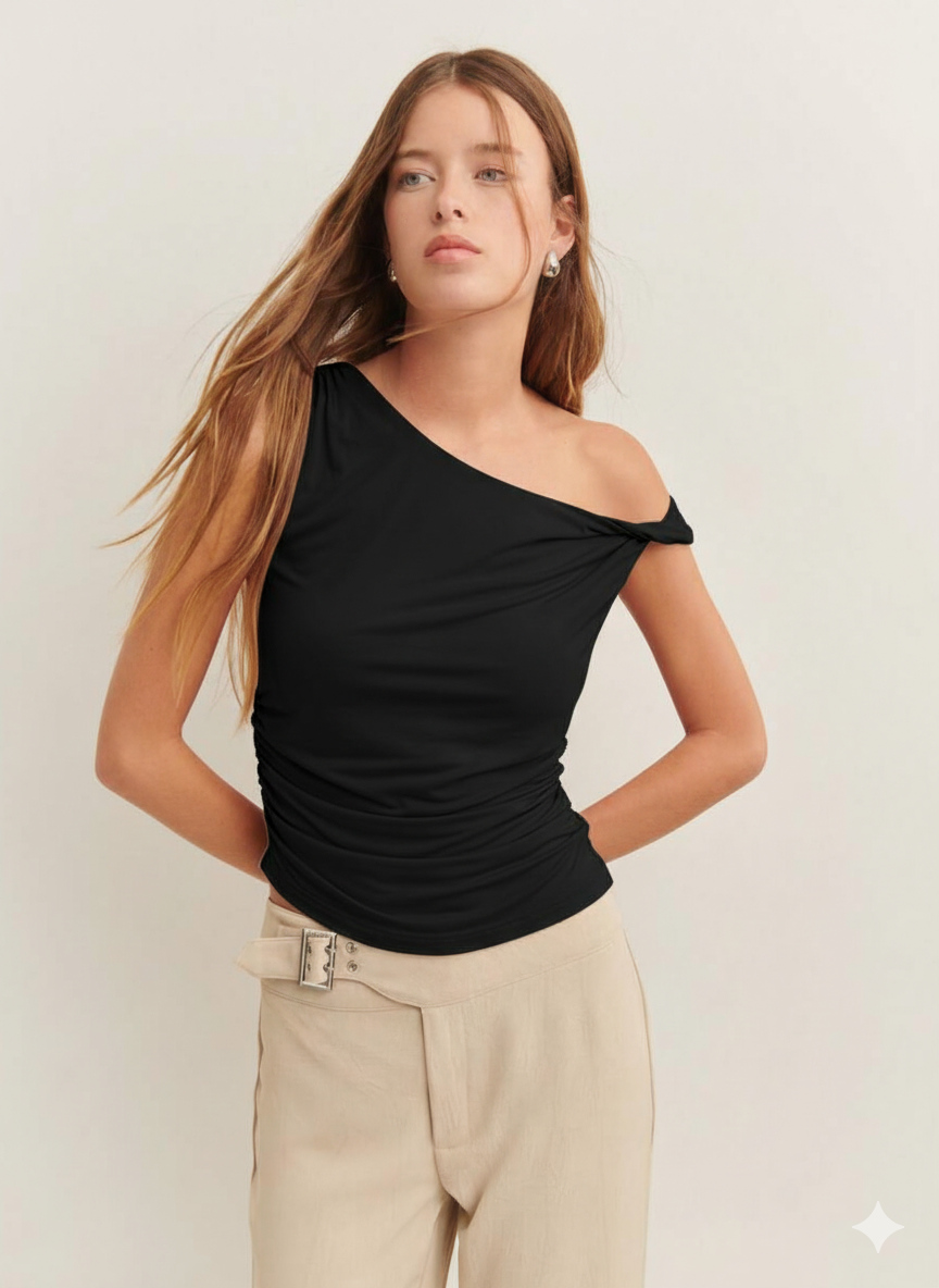 بلوزة أنيقة بتصميم عصري بياقة غير متناظرة وقصّة ضيقة تُبرز القوام، مصنوعة من قماش خفيف ومريح، مثالية لإطلالة أنيقة في أجواء الصيف والعمل اليومي.