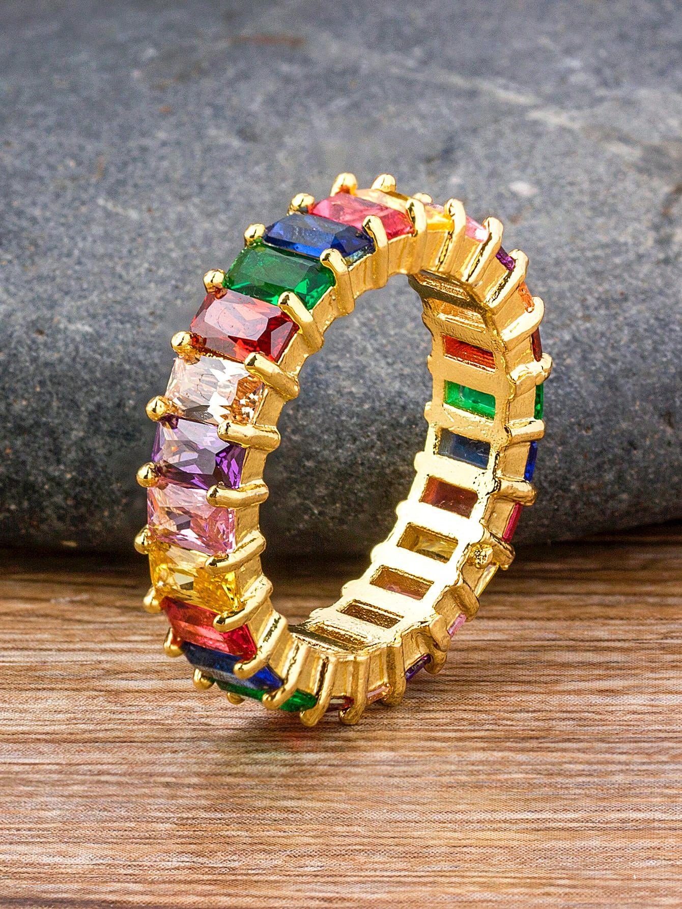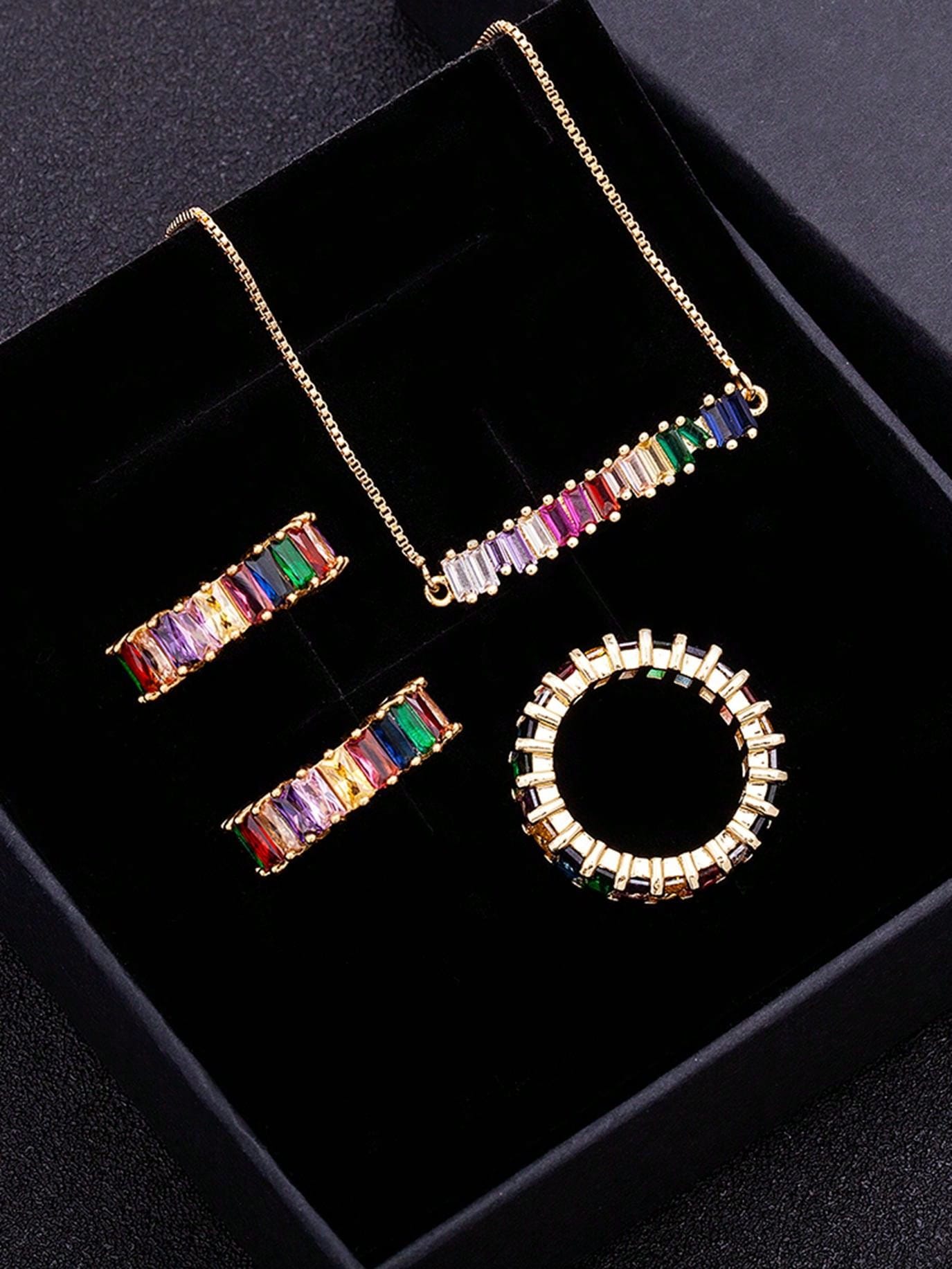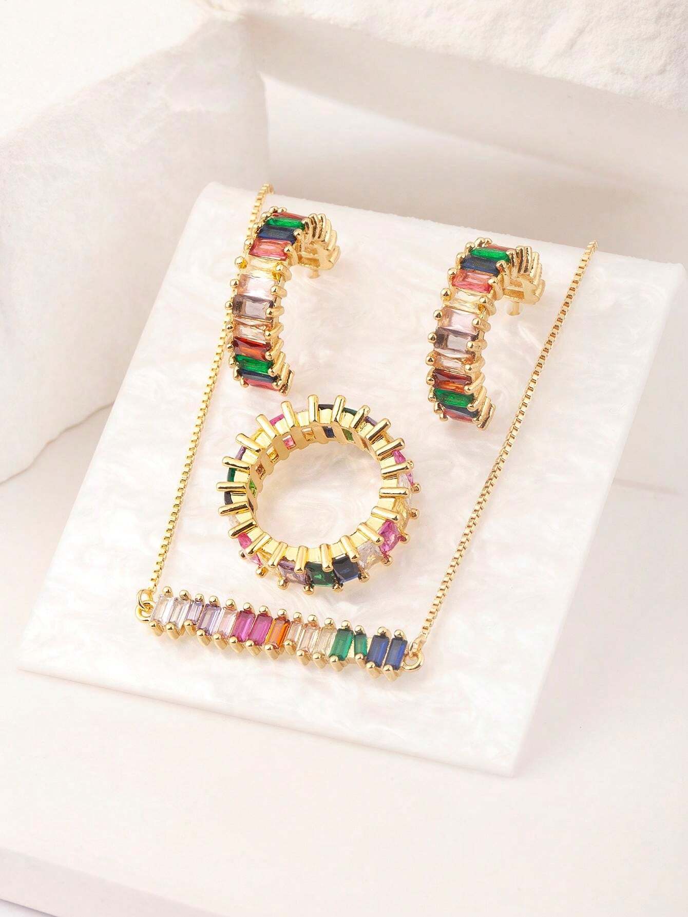 طقم مجوهرات أنيق مكوّن من خاتم وقلادة وأقراط، مصنوع من النحاس ، ومرصع بزركون لامع ملون. تصميم جذاب مناسب للهدايا في عيد الحب وعيد الأم والمناسبات الخاصة، يضفي لمسة فاخرة على الإطلالة.