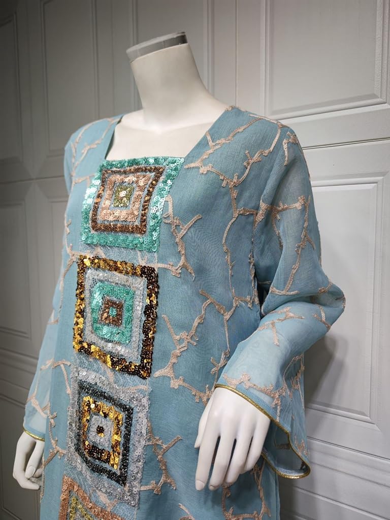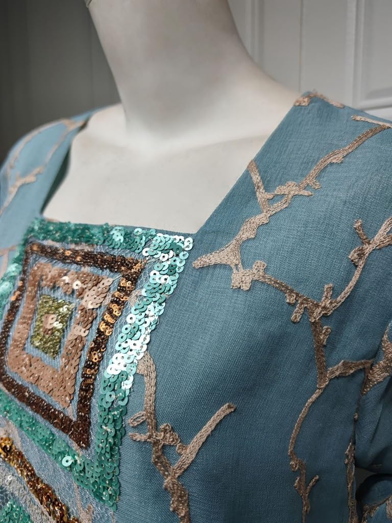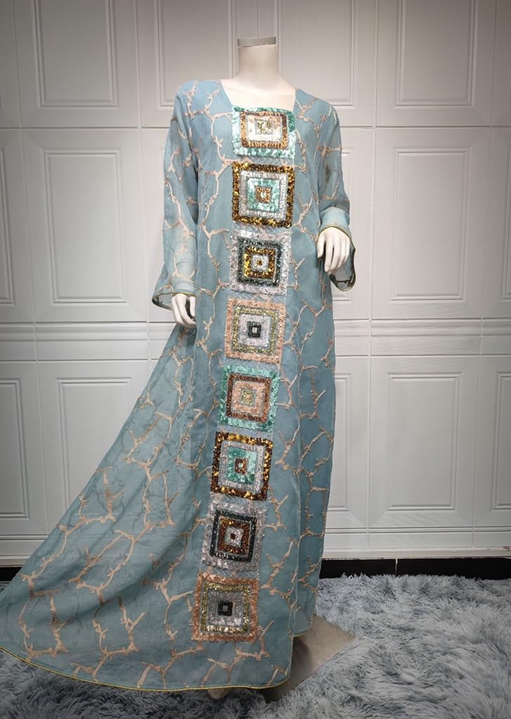 عباية طويلة بلون رمادي فاتح بتطريز هندسي على الجزء الأمامي، تجمع بين خامة خفيفة وانسيابية مع تفاصيل لامعة بسيطة. الأكمام طويلة وواسعة، والتصميم بشكل عام كلاسيكي مريح للحركة. مناسبة للمناسبات الهادئة أو الإطلالات المسائية البسيطة.