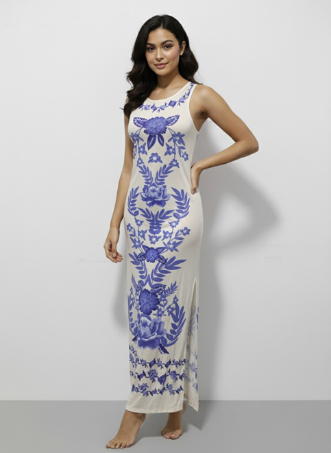 فستان طويل وأنيق بتصميم أنثوي بسيط مطبوع برسومات زهور كبيرة باللون الأزرق على خلفية بيضاء ناعمة. مصنوع من قماش خفيف ومرن يمنح راحة أثناء الحركة، ومثالي للإطلالات الصيفية أو المنزلية الراقية. تصميمه الانسيابي يبرز القوام بلطف ويجمع بين الأناقة والبساطة.