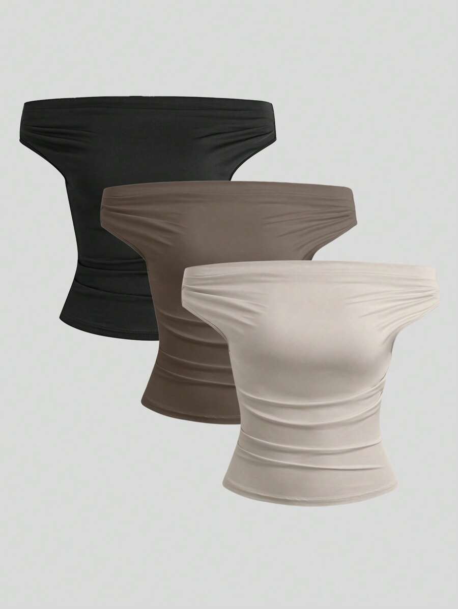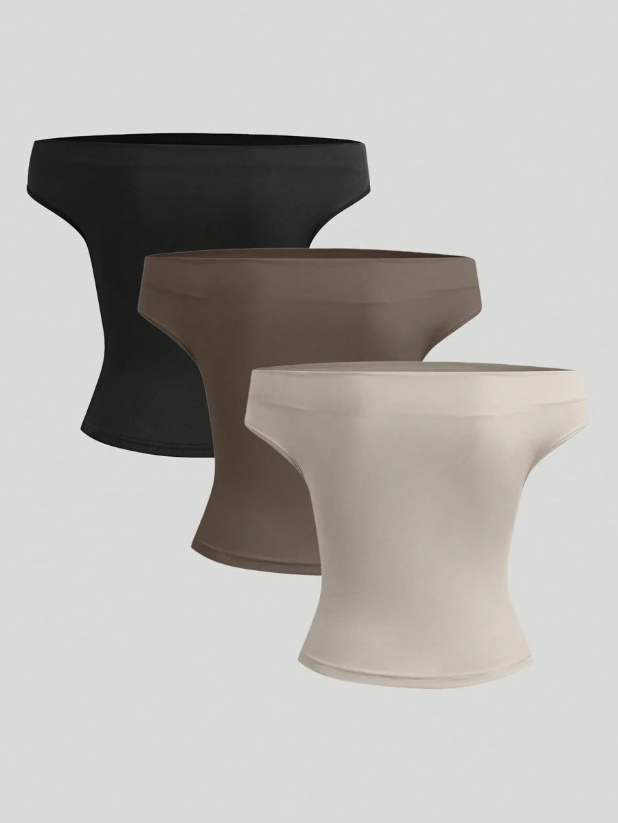 مجموعة من ثلاثة توبات قصيرة بدون أكتاف بتصميم بسيط ومريح. مصنوعة من خامة ناعمة ومرنة توفر راحة أثناء الارتداء وتناسب الإطلالات اليومية أو الصيفية. الألوان المحايدة تجعلها سهلة التنسيق مع مختلف القطع سواء جينز أو تنورة، وتناسب جميع الأذواق.