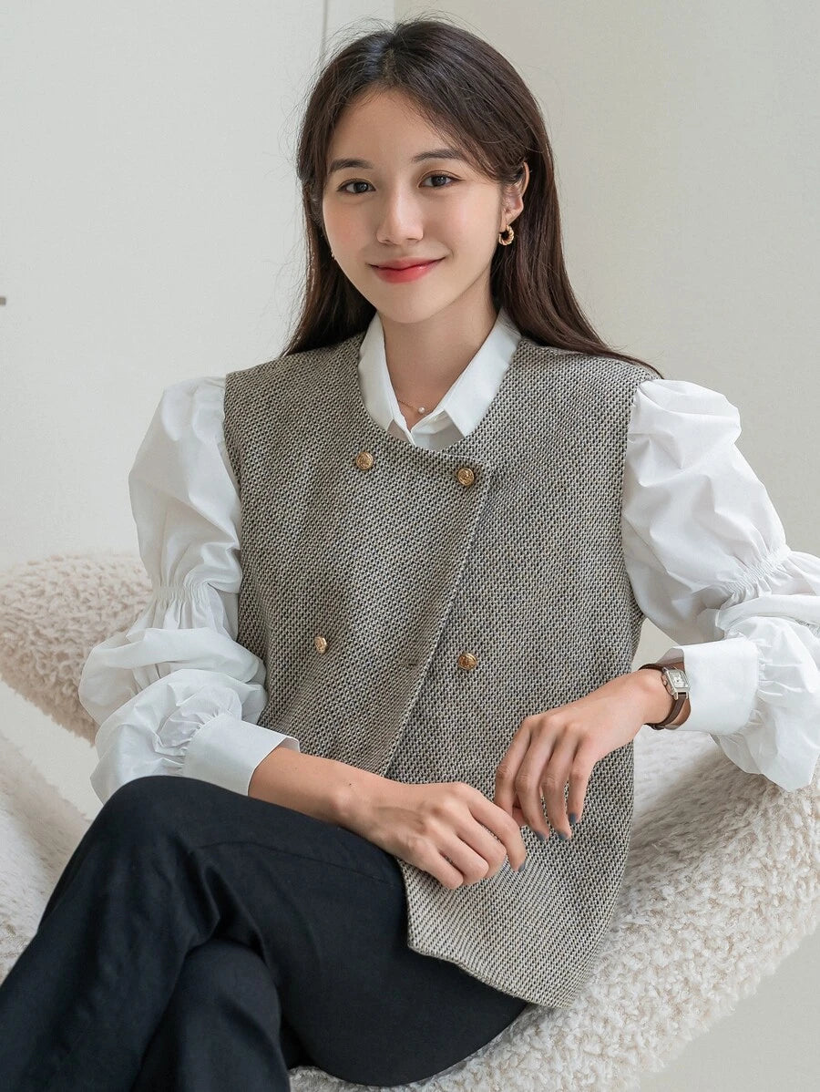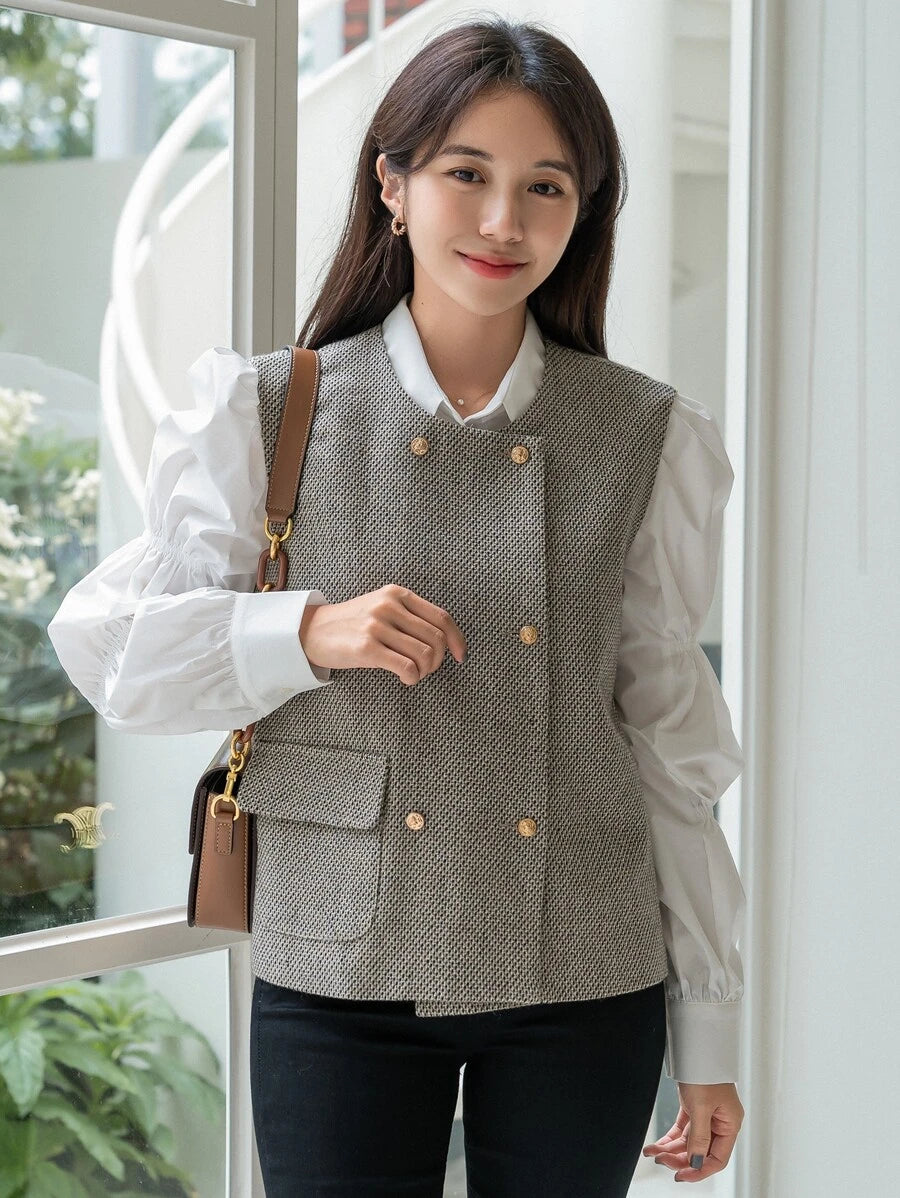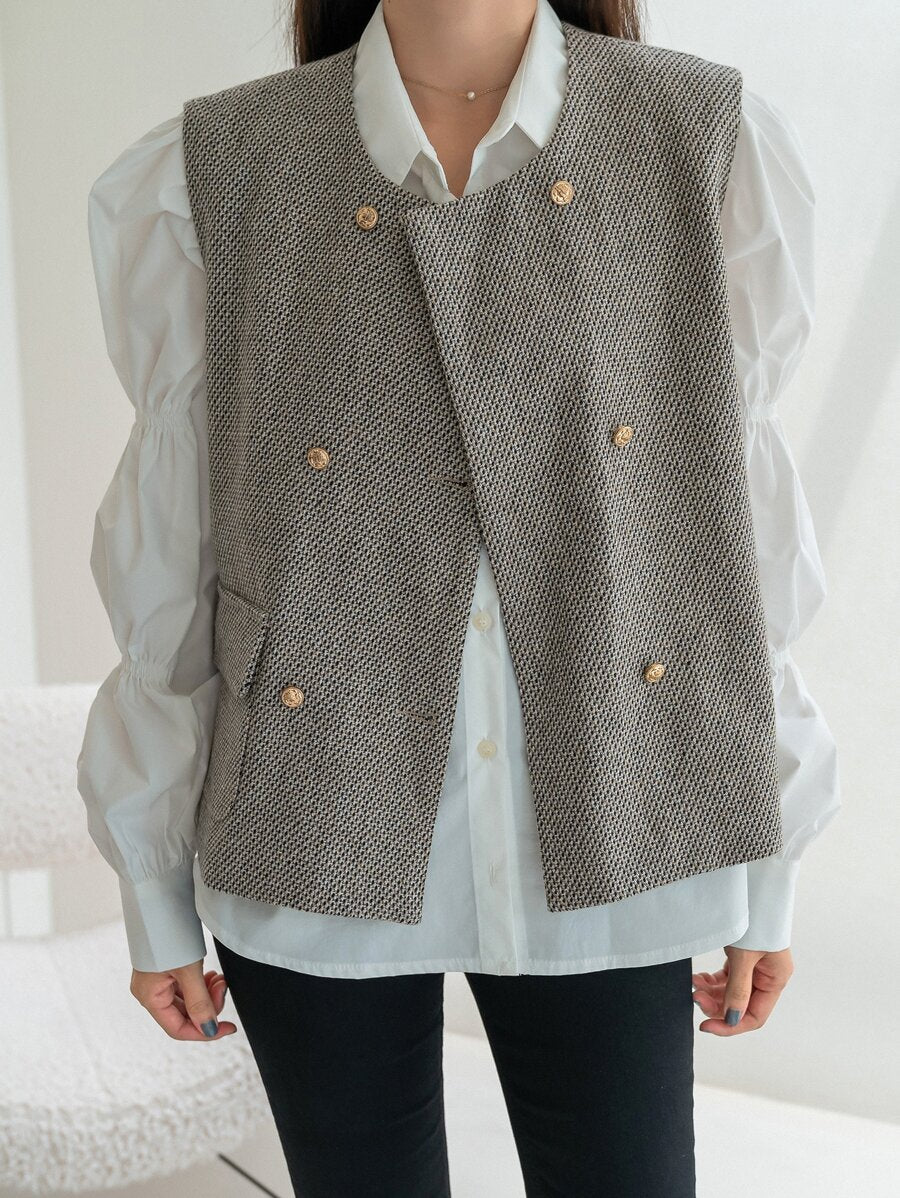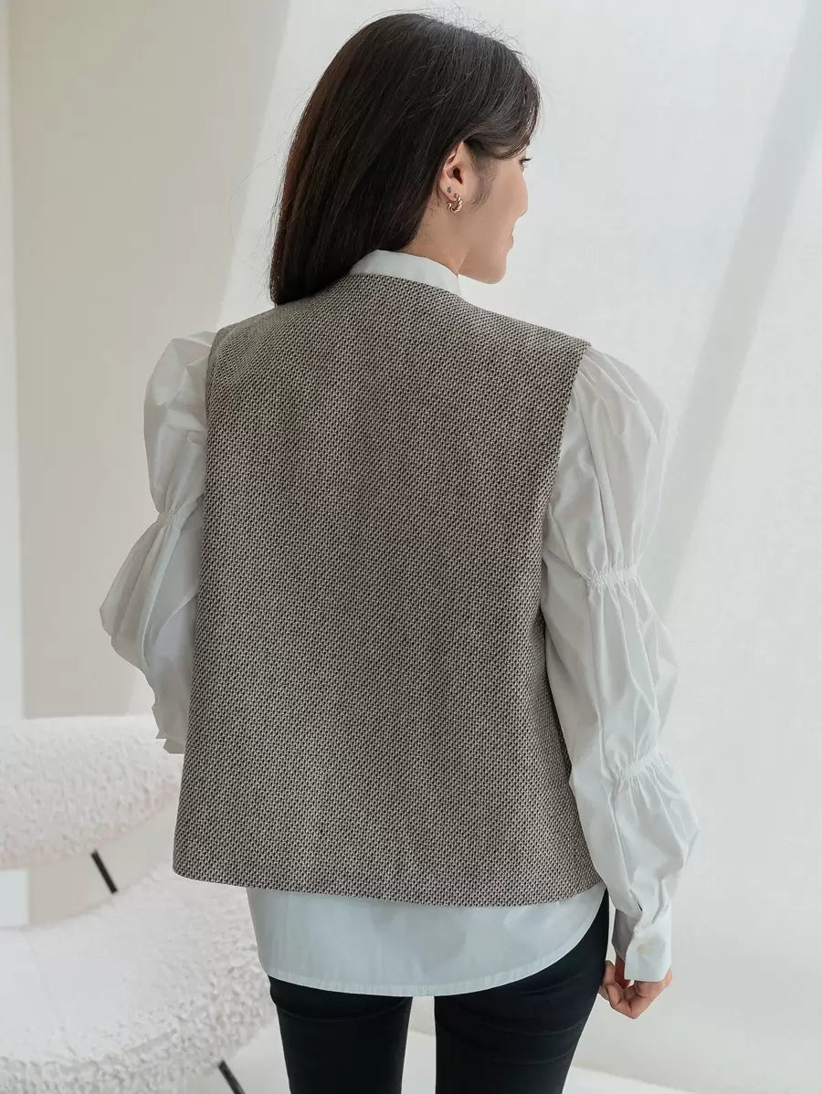 سترة بدون أكمام بتصميم بسيط وعملي تناسب إطلالات العمل اليومية. تأتي بقماش بنقشة دقيقة تمنح مظهرًا أنيقًا مع فتحة أمامية خفيفة تضيف حركة لطيفة للقطعة. يمكن تنسيقها بسهولة فوق قميص أو توب للحصول على لوك مرتب ومناسب للأجواء الخريفية والمكتبية.