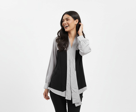 بلوزة أنيقة بتصميم بلونين، تجمع بين الأسود والرمادي لإطلالة عصرية وراقية. تتميز بقصة فضفاضة تمنح راحة وأناقة في نفس الوقت، مع ياقة على شكل V وأكمام طويلة بتصميم كلاسيكي. الخامة ناعمة ومريحة على البشرة، مثالية للإطلالات اليومية أو الرسمية، ويمكن تنسيقها بسهولة مع بنطال أو تنورة لإطلالة متكاملة.