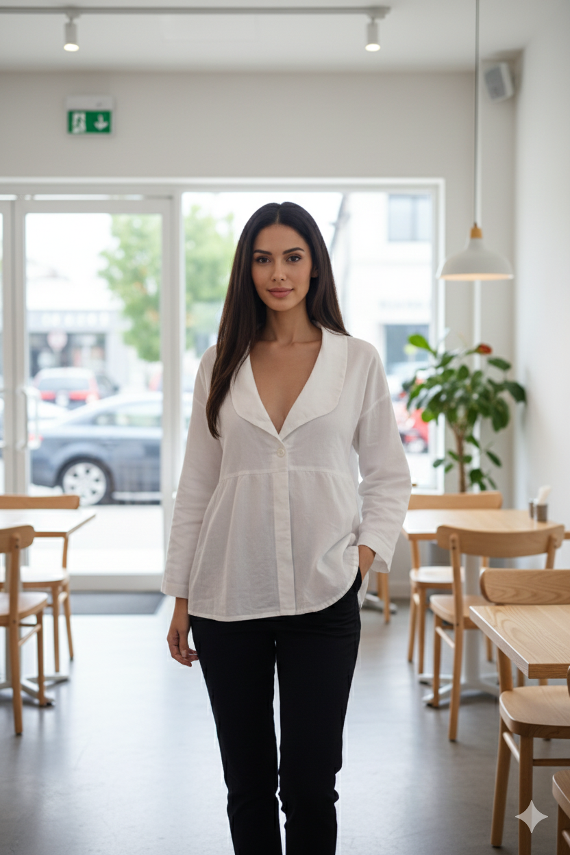 بلوزة مصنوعة من قماش خفيف بلون أبيض نقي، بتصميم فضفاض ومريح مع ياقة كلاسيكية وأزرار أمامية. الأكمام ثلاثية الربع بتدي إحساس بالبساطة والراحة، والقصّة الواسعة بتخليها مناسبة للارتداء اليومي. شكلها أنثوي وعملي في نفس الوقت، وبتتناغم بسهولة مع بنطلون جينز أو قماش.